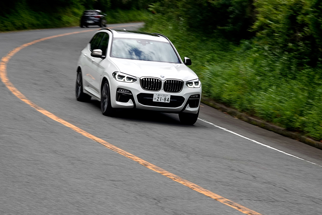 もちろん、回転を上げていくと、さすがにガソリンエンジンのような高回転域でのパンチ力は味わえない。この点は、ディーゼルとガソリンとの明確に差異といえるだろう。しかし、X3 M40dの6気筒ディーゼルターボは、一般的な4気筒ディーゼルエンジンのように、高回転域で急激にパワーがしぼんでいく印象はなく、スーッと吹け上がっていく感覚。そのため、峠道でもしっかりと走りを堪能できる。