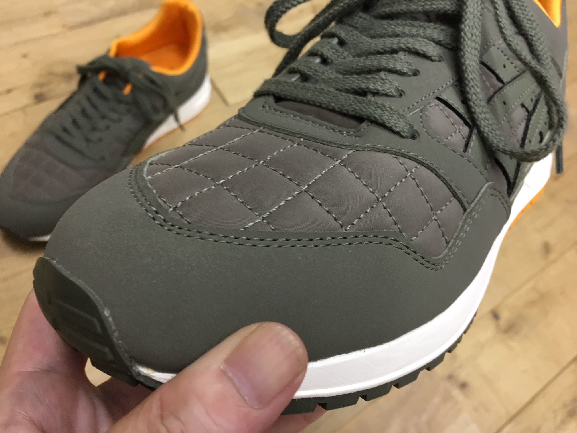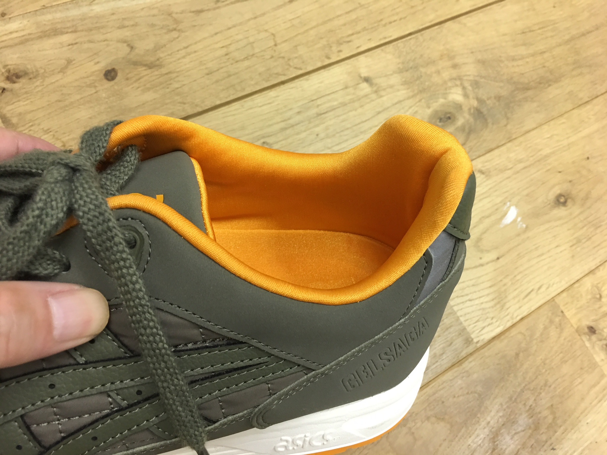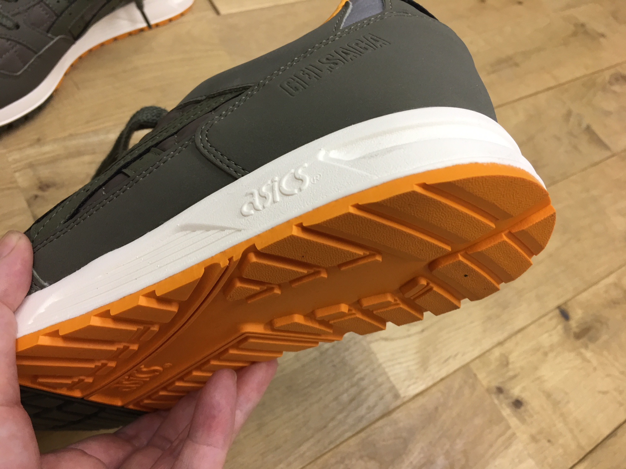 アウトソールは中央と後ろ部分がエマージェンシーオレンジで、前方は落ち着きのあるグリーンに。この過剰に味を加え過ぎない、絶妙なバランスがイイ!