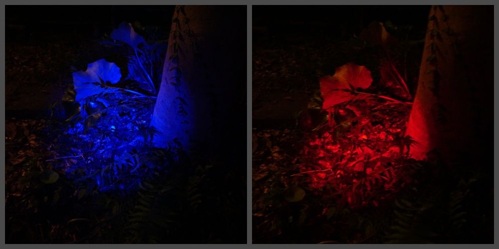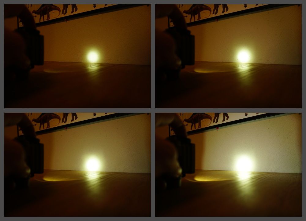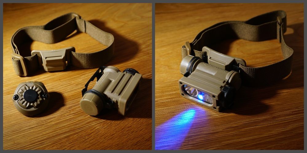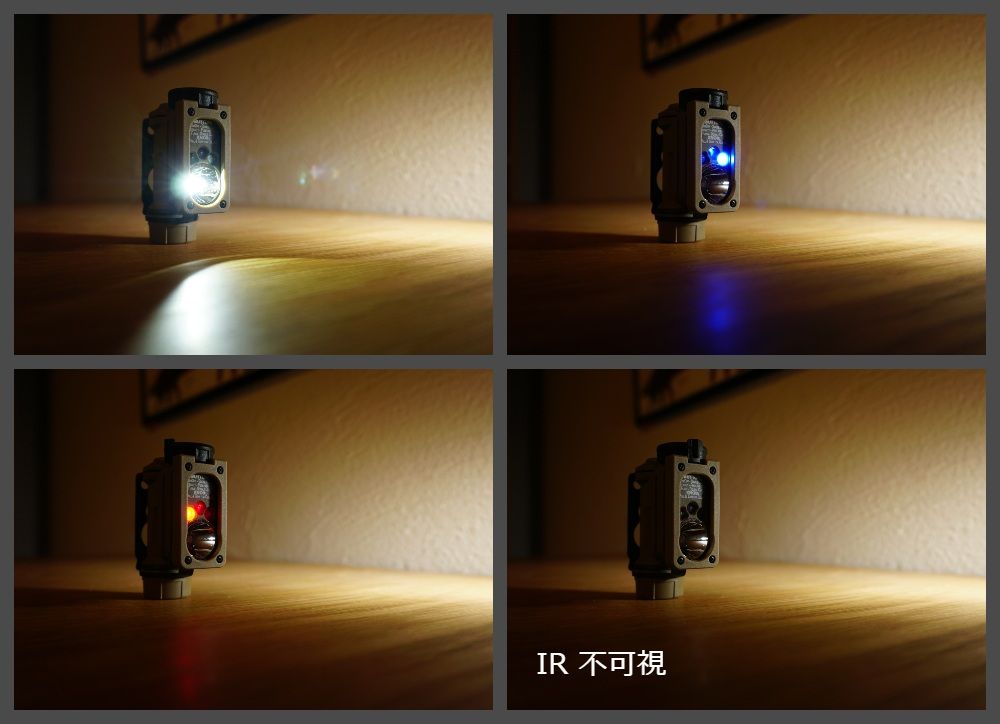 光源となるLEDは4種搭載されており、メインの白色光の他、赤、青、IR(不可視赤外線)があります。各LEDに切り替える際は、スイッチボタンの付いている黒いダイヤルを引っ張りながら回し、任意のLEDに設定します。あまり他のライトにはないユニークな設定方法ですが、誤操作のない確実性を重視したものと思われます。白色以外のライトでも4段階の調光が可能です。