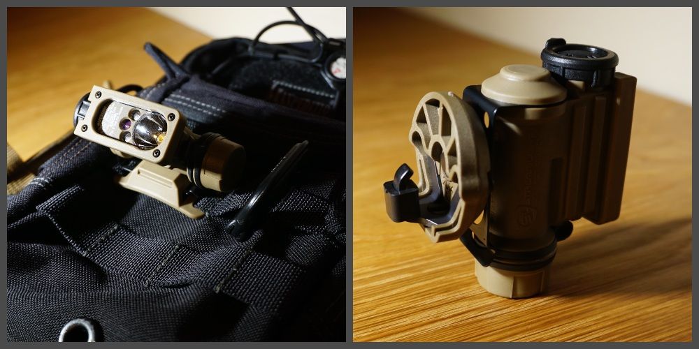 ヘッドバンドは頭部に付けて使うためのバンドとマウントのこと。ミリタリーライトではありますが、普通のヘッドランプのように使うことも可能です。ヘルメットマウントはミリタリータイプのヘルメット、具体的には米軍の使用するACHや自衛隊の88式などへの装着事例があります。装着箇所は即頭部付近。ヘルメットのリム部分に引っ掛けて使用します。