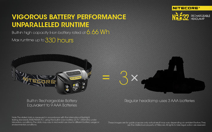冒頭で、単4電池3本クラスのライトよりもひとまわり小さいと言いましたが、ナイトコアのホームページには、単4電池3本のライト3本分の活躍だぜ、と謳っています。これについて少し解説しましょう。