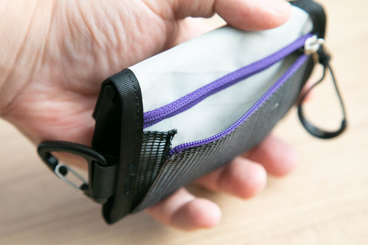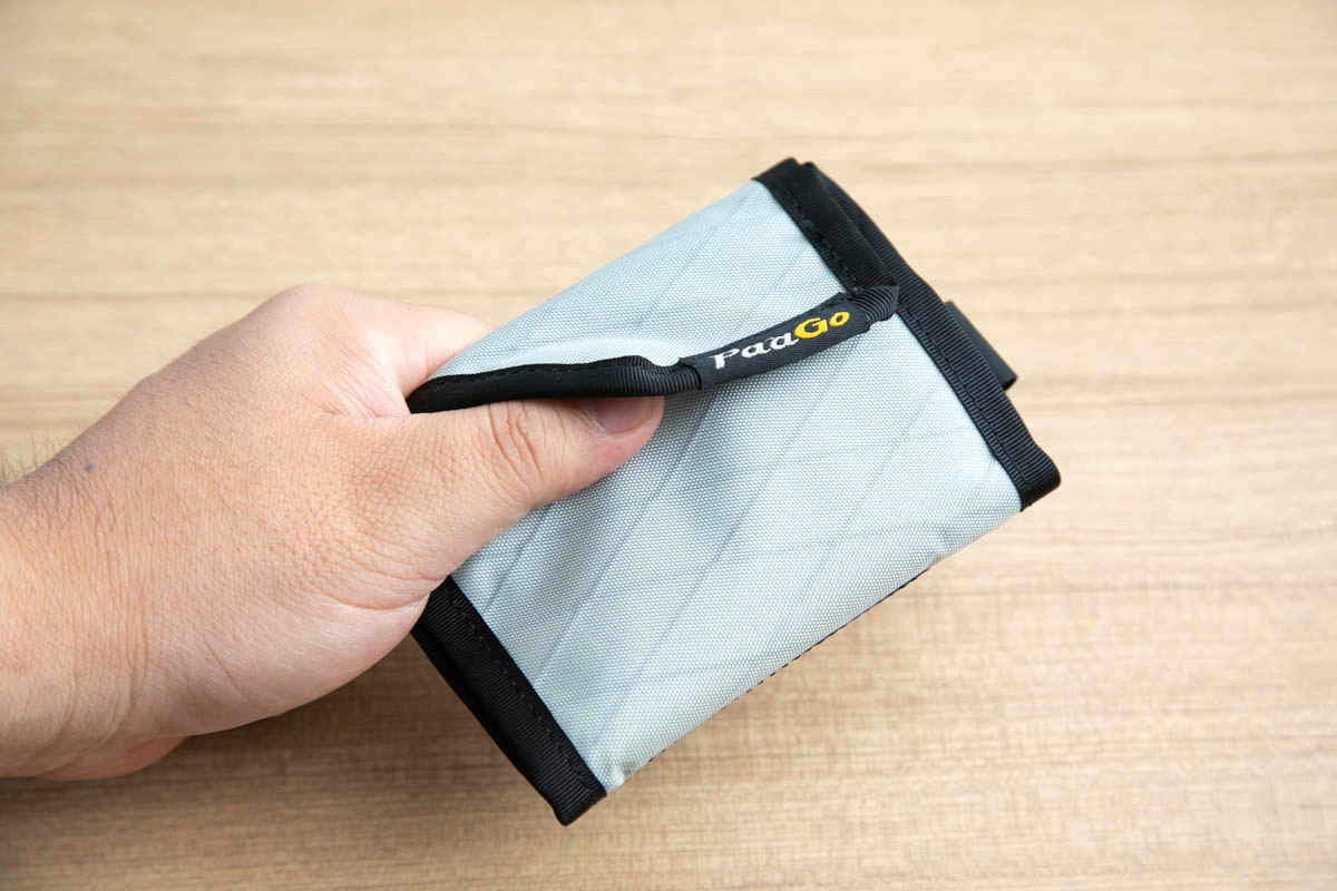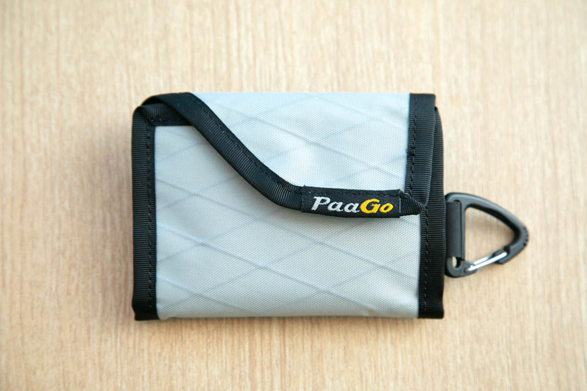この財布、見た目はかぎりなくペリペリ財布です。メインの素材はX-Pac。ヨットの帆を作っているメーカーが開発した特殊生地で、軽くて薄いという特徴があります。アウトドアのバックパックでも最近X-Pacを使ったモデルが増えてきているという注目の素材です。だからこの「TRAIL BANK - M」も軽い! 重さはわずか45g!