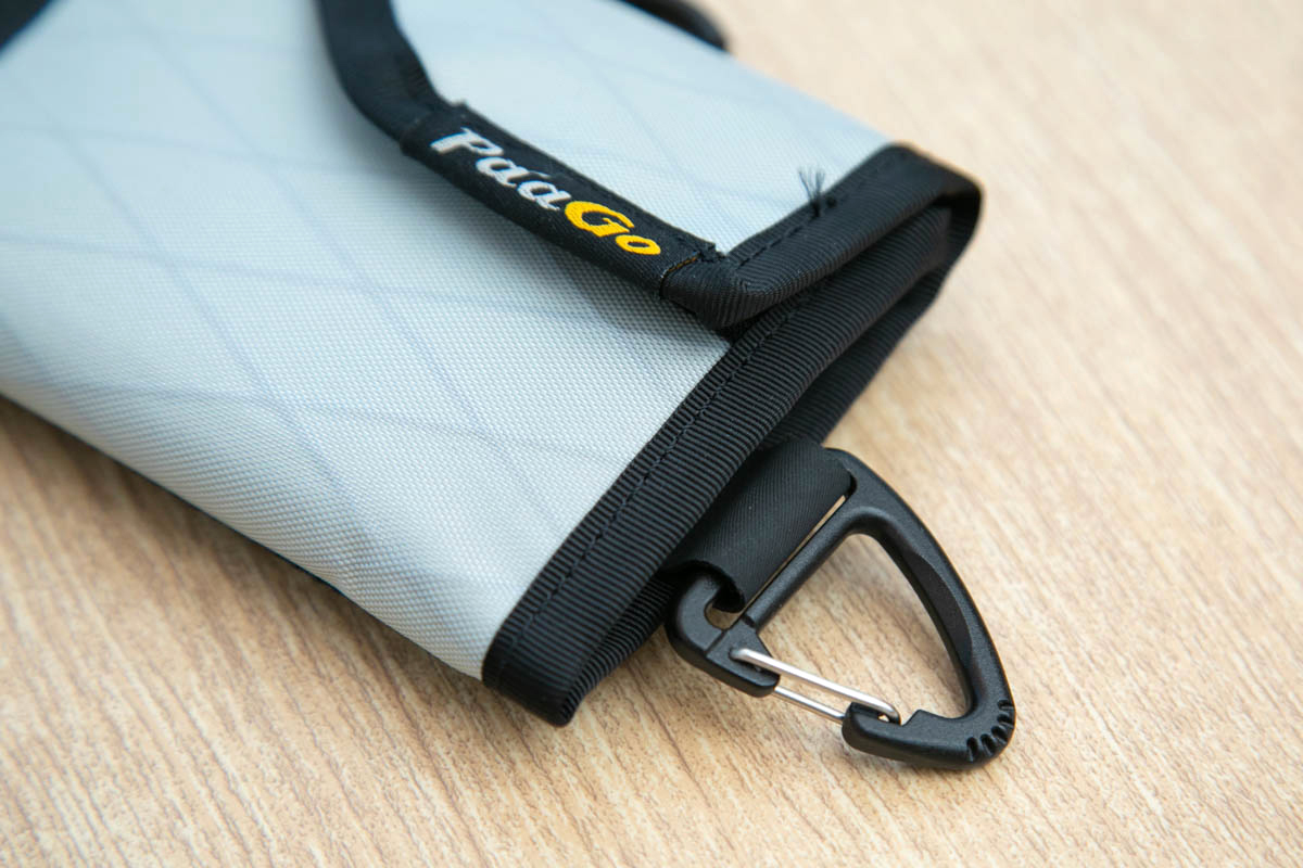 それがこのカラビナ状のパーツです。ここにウォレットコードなどを付けて、パンツのベルトループに引っ掛ければOK。ウォレットコードを付けられる小さい財布って意外となかったりするので、これは助かる。