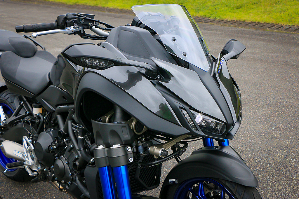 ヤマハではこうしたスタイルのモデル群を“LMW(リーニング マルチ ホイール)”と呼んでおり、これまでスクータータイプの「TRICITY(トリシティ)」シリーズをリリースしていましたが、今回紹介するNIKENは、ギヤチェンジが可能なスポーツタイプのLMW。バンク角も、TRICITYの38度から45度へと大きくなっており、より深く車体を傾けて曲がることができます。