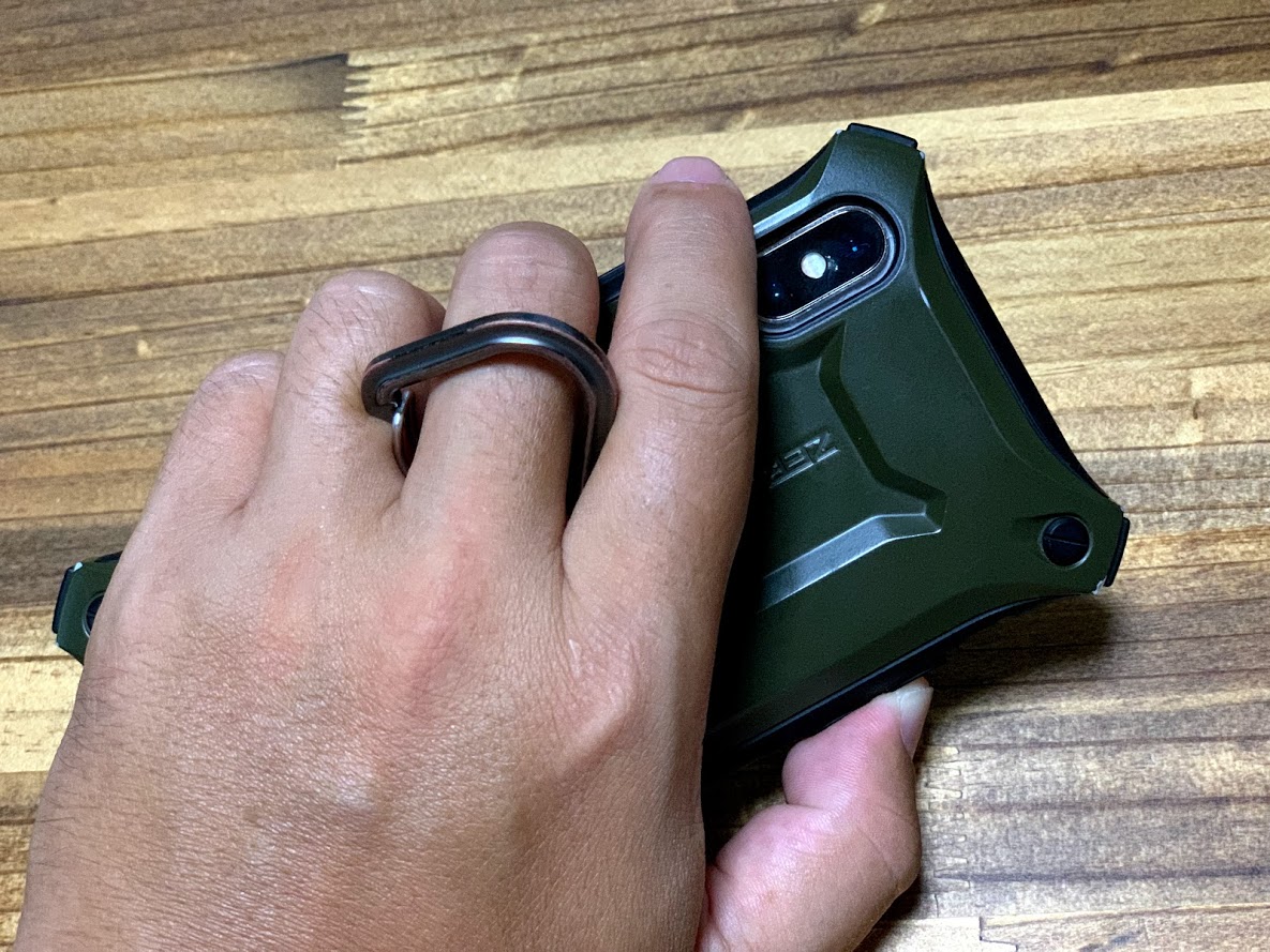 エレコムから発売されているPM-A18BZEROKシリーズ「iPhone XS(※XRもあり)用ZEROSHOCK」(実勢価格:3000円前後)は、リングの代わりにカラビナが付いた見た目のゴツいiPhoneケース。アウトドアっぽい仕様のカーキを使っていますが、全8色という多彩なカラー展開で好みに合わせて選べます。