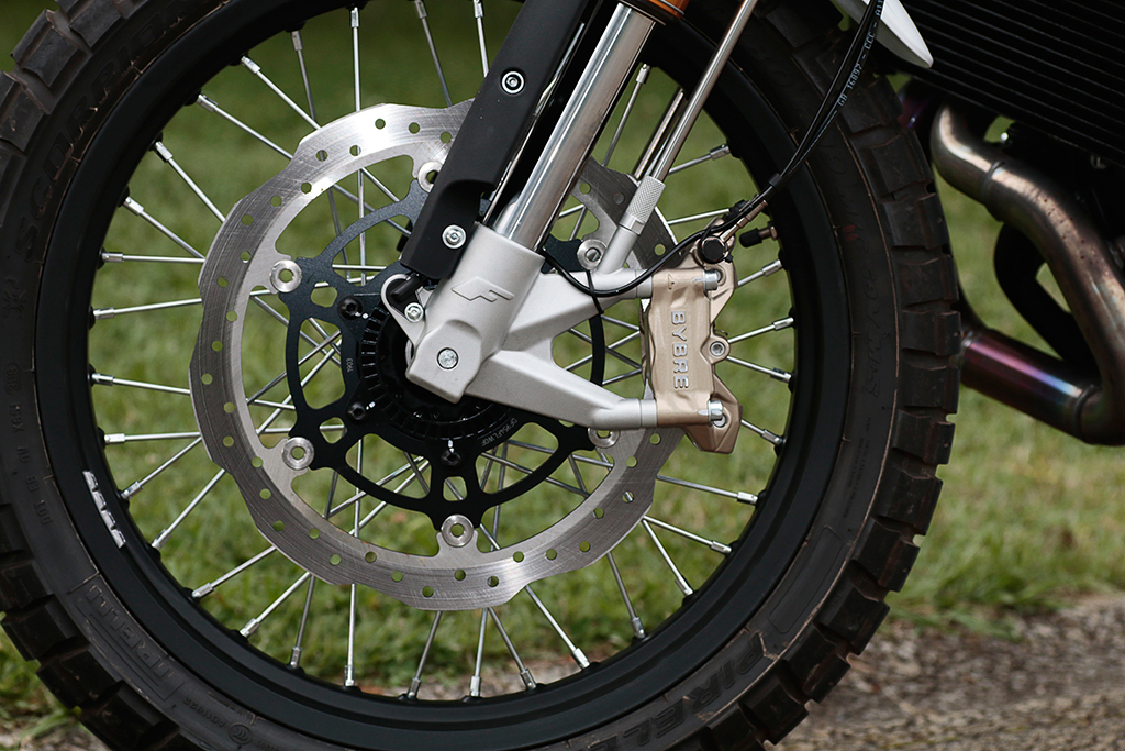 キャバレロシリーズの2モデルは、ベースは同じマシンですが、シート形状やタイヤサイズが異なります。クラシカルなタックロールシートのスクランブラー、シングルシート風の、テール形状と一体化したデザインを採るフラットトラック。タイヤサイズは、前者が前19インチ/後17インチ、後者はなんと前後とも19インチ! 大きくファットなタイヤが特徴的です。赤と黄色のペイントが目に鮮やかなスクランブラーに対し、フラットトラックはマットなブラックでクールにキメる。見事に、2車を作り分けていますね。