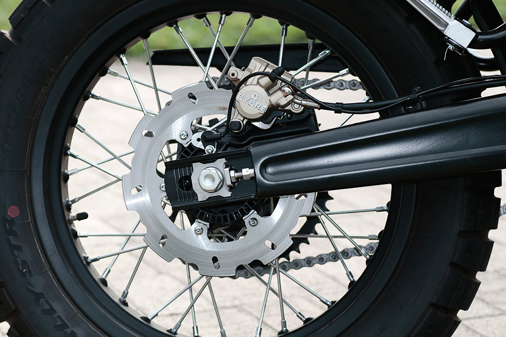 さて、前後に19インチを装着するフラットトラック125は、立ち姿からして個性的。いわゆるトラッカーらしい、冒険心にあふれたスタイルです。カタログ上のシート高は820mm。普通のオフロードモデルなら、ライダーがシートにまたがるとググッとボディが沈んで足つきがラクになるのですが、フラットトラックのそれは予想外にしっかりしている。あまり車高が落ちない。そのため、身長165cm(短足)の自分だと、両足がつま先立ちになります。赤信号などの停車時には注意しないと…。