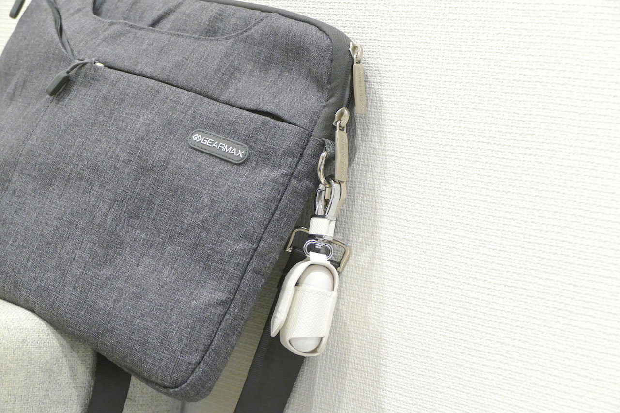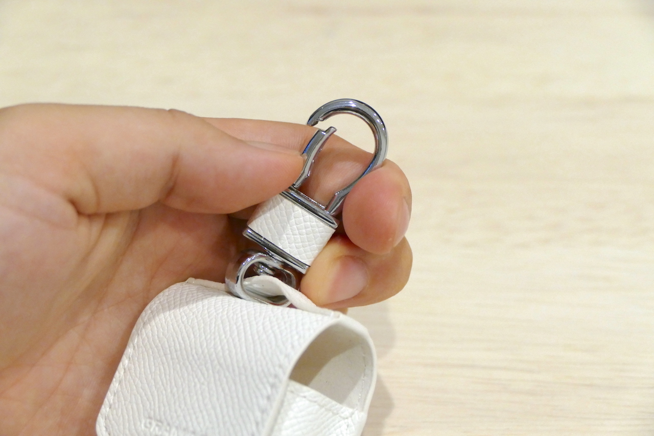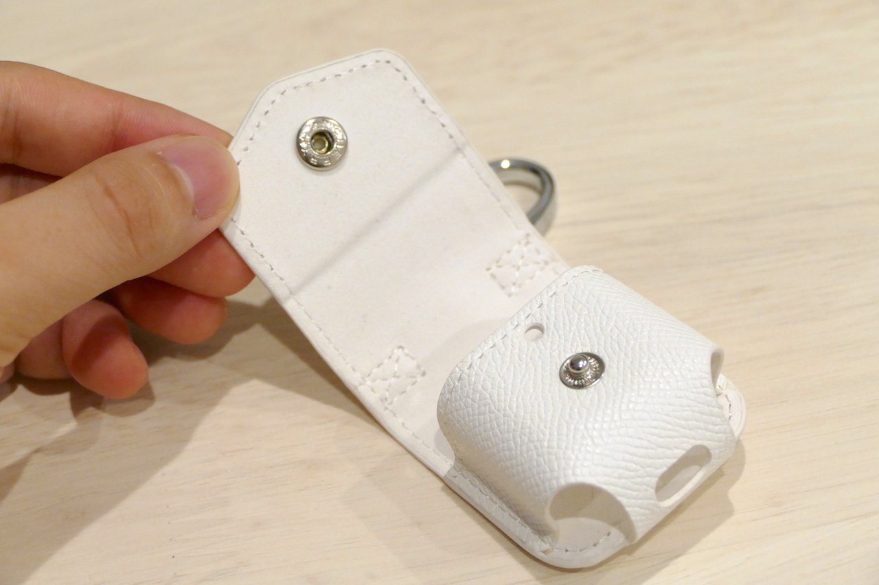 とはいえ、向きは自由に変わるので、そこまでこだわらなくても大丈夫です。カバンに装着するときなどは、先ほどと反対向きの方が使い勝手は良いかもしれません。AirPods本体を取り出すときには、AirPodsのケースを少し引き出すようなイメージで蓋を開けてあげると取り出しやすいはず。