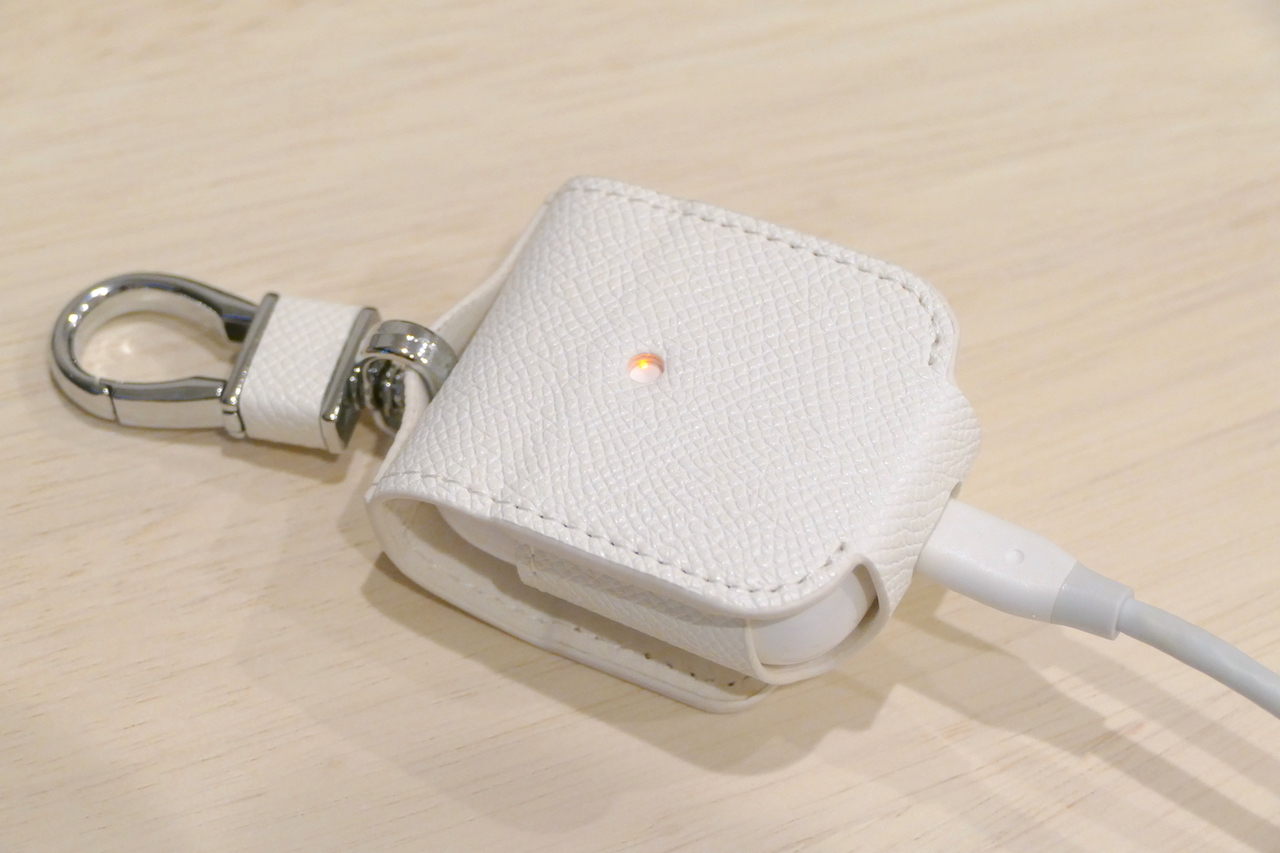 また、正面、背面ともにLEDインジケータが見えるよう、小さな穴が開いています。AirPodsは第一世代と第二世代でインジケータが付いている向きが違いますが、これならどちらをどういう向きで入れても大丈夫。