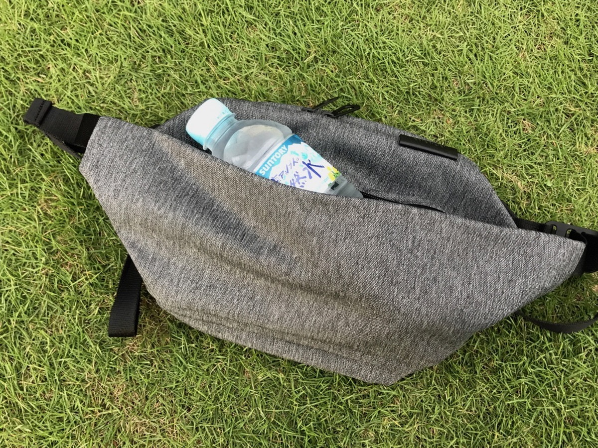 前面のコンパートメントは、思ったほどマチはないものの、そこそこ幅があるので500mlのペットボトルを収納できます。というか、実はペットボトルが入るミニショルダーを探していたんです。夏に使っていたサコッシュはラクチンでしたが、ペットボトルが入らないのはやっぱり不便で…。そんな事情もあって、ミニバッグといえどもペットボトル収納サイズは必須なワケです。