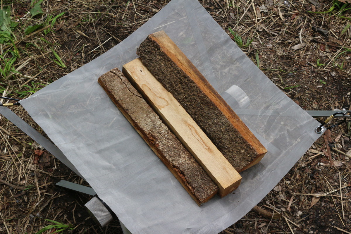 使用時のサイズは43×46×H24cm。長さ39cmの薪を載せてみました。わずかに中央がくぼみ、脇から落ちることもなくしっかり支えてくれます。耐荷重は公表されていませんが、6〜7本の薪を載せてもアームと脚がぐらつくことはないし、メッシュに取り付けられたハトメが変型することもありませんでした。