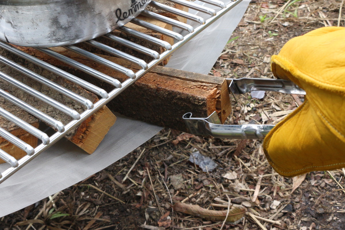 ちなみに、グリルメッシュを載せたままでも薪をいじれます。火力調節ほか火の世話をする際にいちいち「GRILL MESH」を移動させる必要がないのがいいですね。