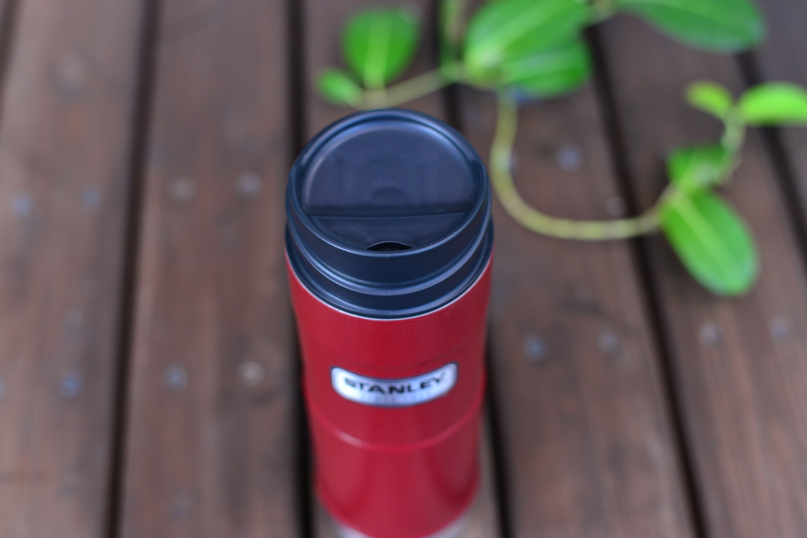 スタンレーはちょっとした散歩にぴったり。飲み口のプッシュボタンは片手で押せるので、歩きながらでも飲めますし、凹凸デザインで、リュックのサイドポケットに入れていても指が引っかかりやすく取り出しやすい点もメリット。