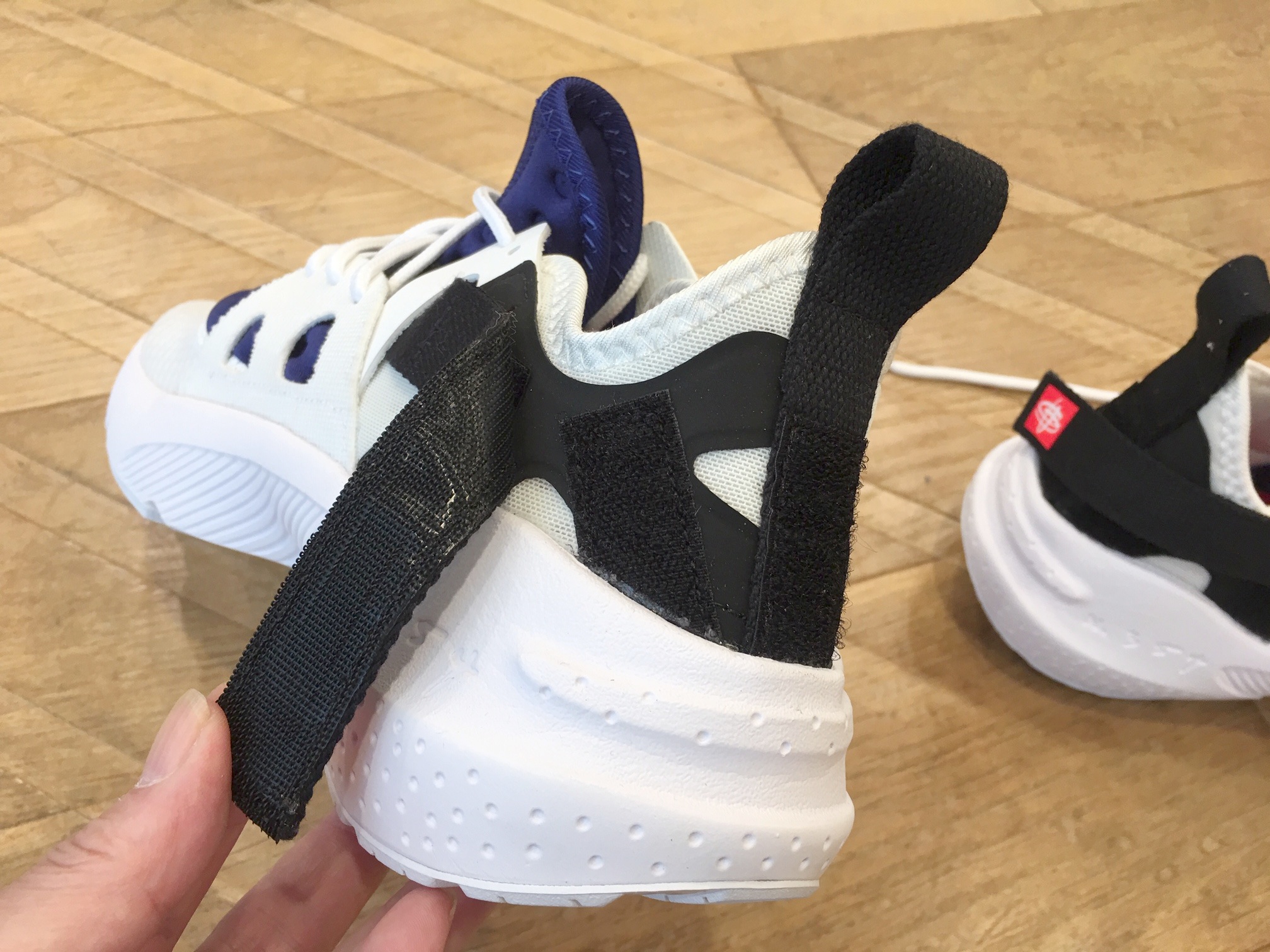 “ハラチ システム”の特徴的なヒールストラップには面ファスナーが設けられ、かかとのフィッティングを好みで調整可能に。ちなみにコレが過去のプロトタイプからフックアップしたディテールなのです。