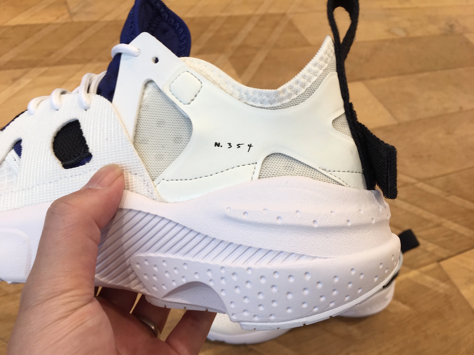 サイドパネルは、お馴染みのスウッシュが省かれて、代わりに“N.354”の文字が。ちなみにこの“N.354”とは、過去の名品のプロトタイプにあるディテールをベースに、現代のテクノロジーを組み合わせて新しいデザインのシューズを生み出す新レーベル「N.354」のロゴなんです。ってことで、本作はN.354シリーズからの新作となります。