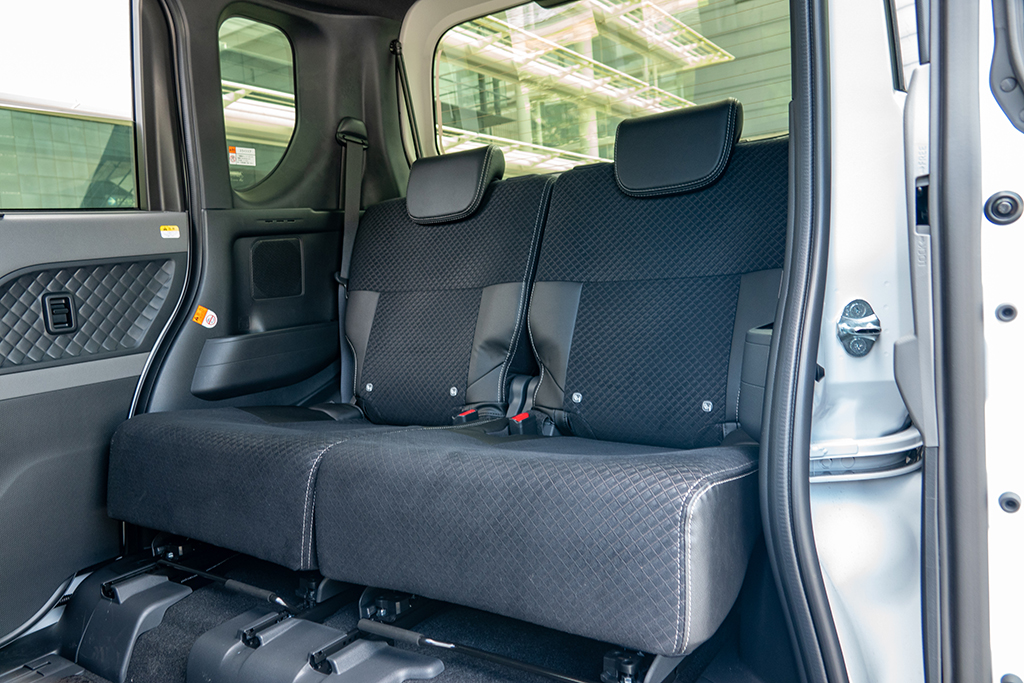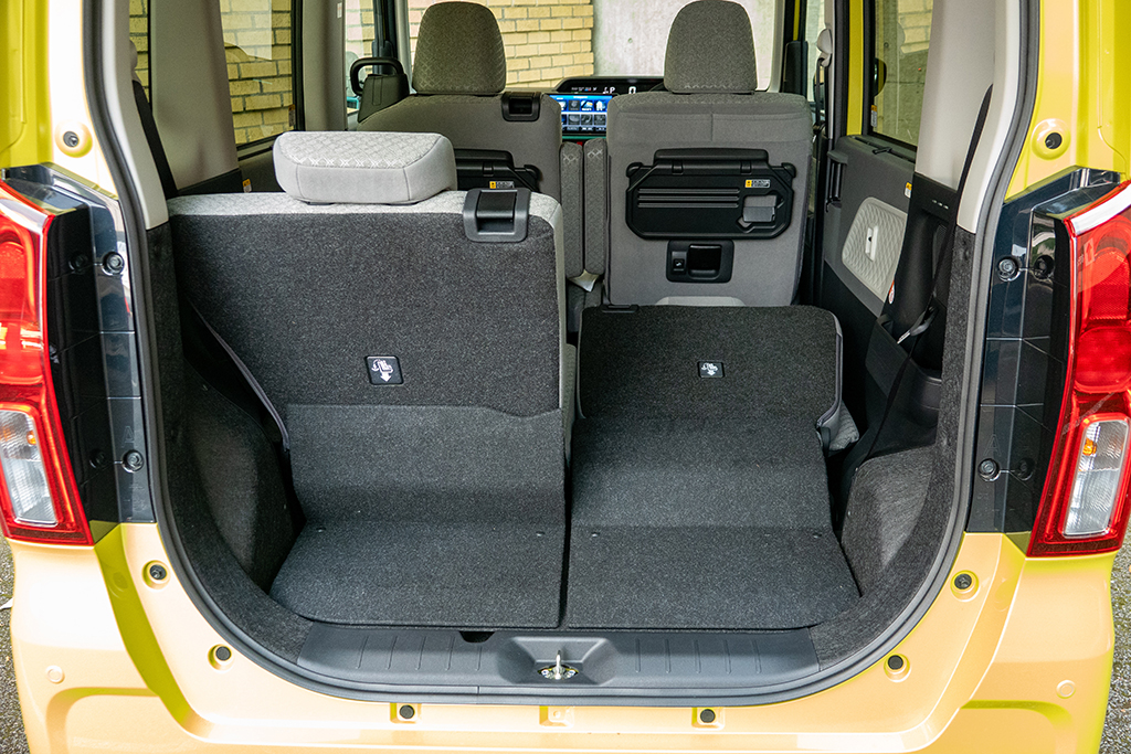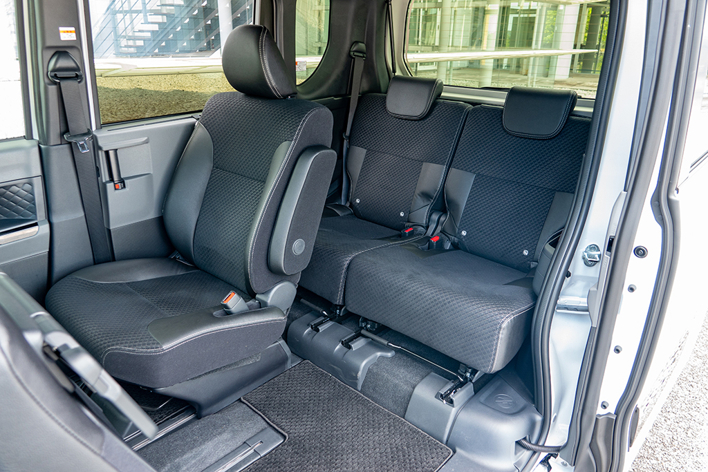 室内の広さは、天井の高さはもちろんのこと、リアシートの取り付け位置にも起因する。スーパーハイトワゴンは背の高さを生かし、リアシートを高い位置に取り付けられるのだ。その結果、リアタイヤの張り出しによる影響を受けにくく、後席をより後方にレイアウトすることが可能に。その分、前後シートの間隔を広げることができるから、後席の足下スペースを驚くほど広くとれるのである。