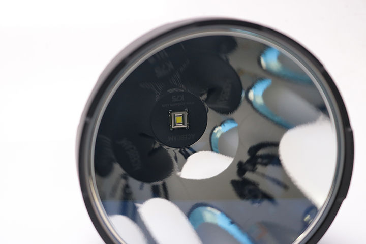 ぱっと見の外観は過去のKシリーズによく似ています。が、ヘッドのデカさがやばいです。ヘッド直径は126mm。ちょっと信じがたいサイズです。過去20年近く、ターボヘッドのスタンダードサイズは63mmでした。2.5インチ、SUREFIRE M4/M6などのヘッドサイズですね。その倍の大きさ。肩から下げるようなサイズのライト、あるいは巨大な電池ボックスを持つライトなど、片手でのハンドリングを前提としないライトは過去にもありましたが、片手で扱うライトでは滅多に見られないサイズです。