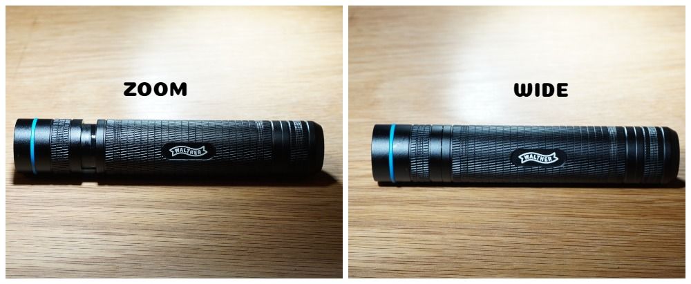 常にHiモード点灯から始まり、点灯後に長押しするとオートストロボ点滅します。ワルサーらしいタクティカルな要素もあり、この手のライトを持ったことのない人は面白いと感じるのでは。