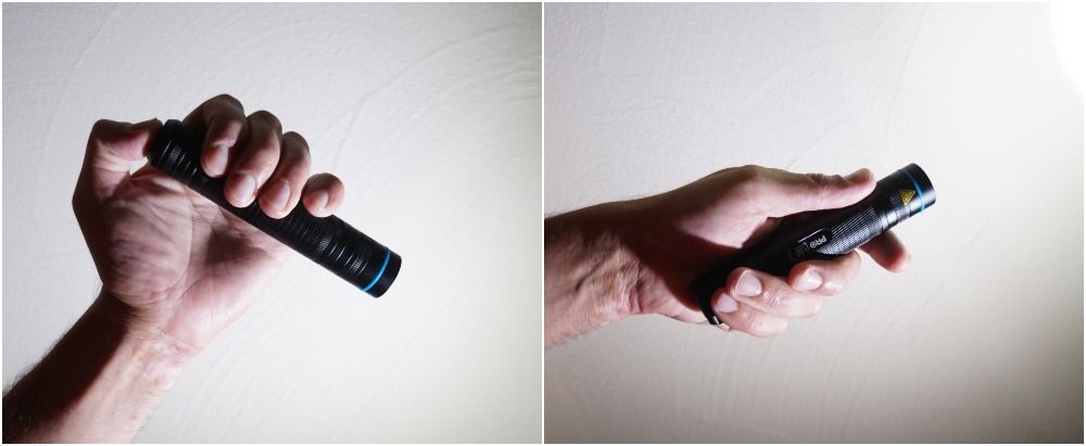 ボディに大きな凹凸はなく、滑り止めのナーリングが全周に施されているだけのシンプルなデザイン。そのため、しっかりと握れます。逆手に持っても、順手に持ってもいい感じ。スイッチはテール部にあるプッシュ式のボタン。平らな電子式のスイッチですが、クリック感があり操作性は上々。
