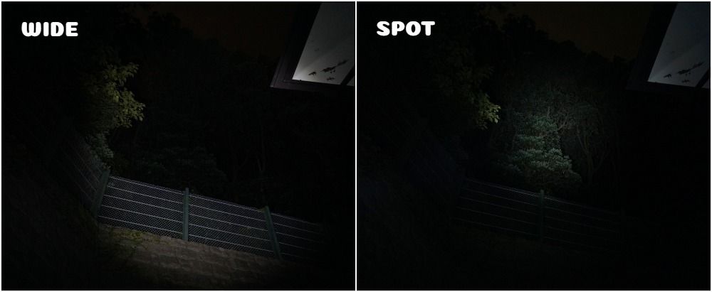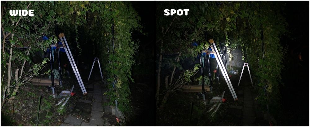 ワイドとスポットの違いは確かにあります。しかし、手前に障害物などがある場合は割と周辺光の存在を強く感じます。極端に絞られる感じではなく手元から帯状に照らす感じです。完全なピンでの照射をするにはレンズが小さく、そこまで集光はされません。搭載されるLEDの大きさを鑑みても、妥当な配光なのかな、と思います。