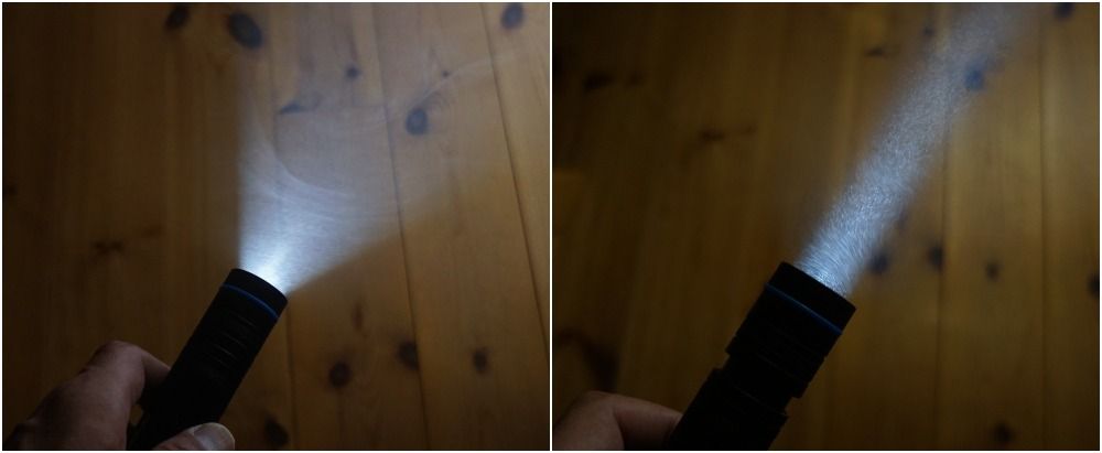ヘッド部はツイスト式のフォーカスレンズが付いています。リフレクターではなくレンズ照射になります。そのため、ヘッドを前方に伸ばすと照射光が絞られスポットな配光に、元に戻すとワイドなフラット配光になります。近くを照らすときはムラのないフラット光、遠くを照らすときはスポットと、状況や用途に合わせて切り替えられます。