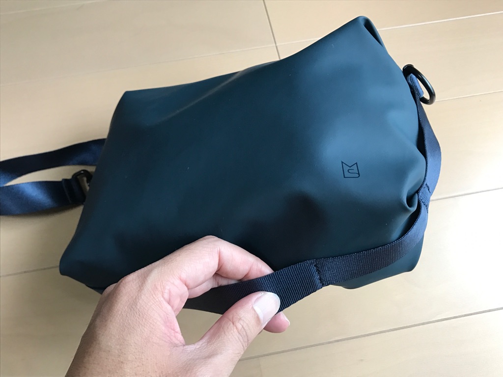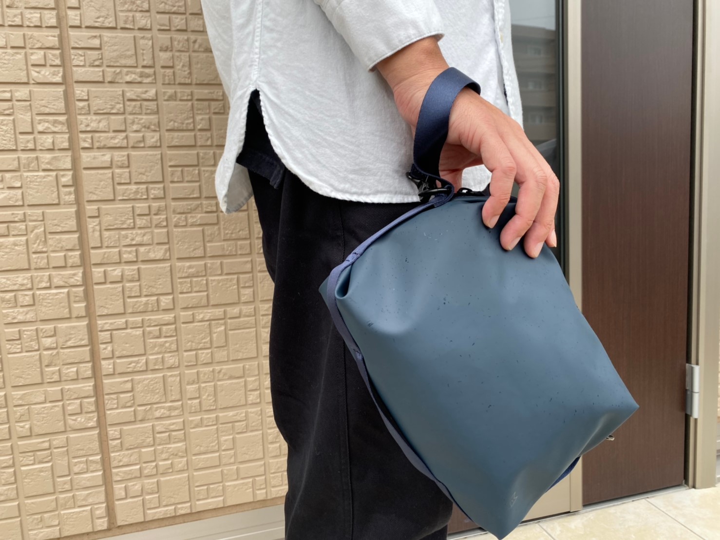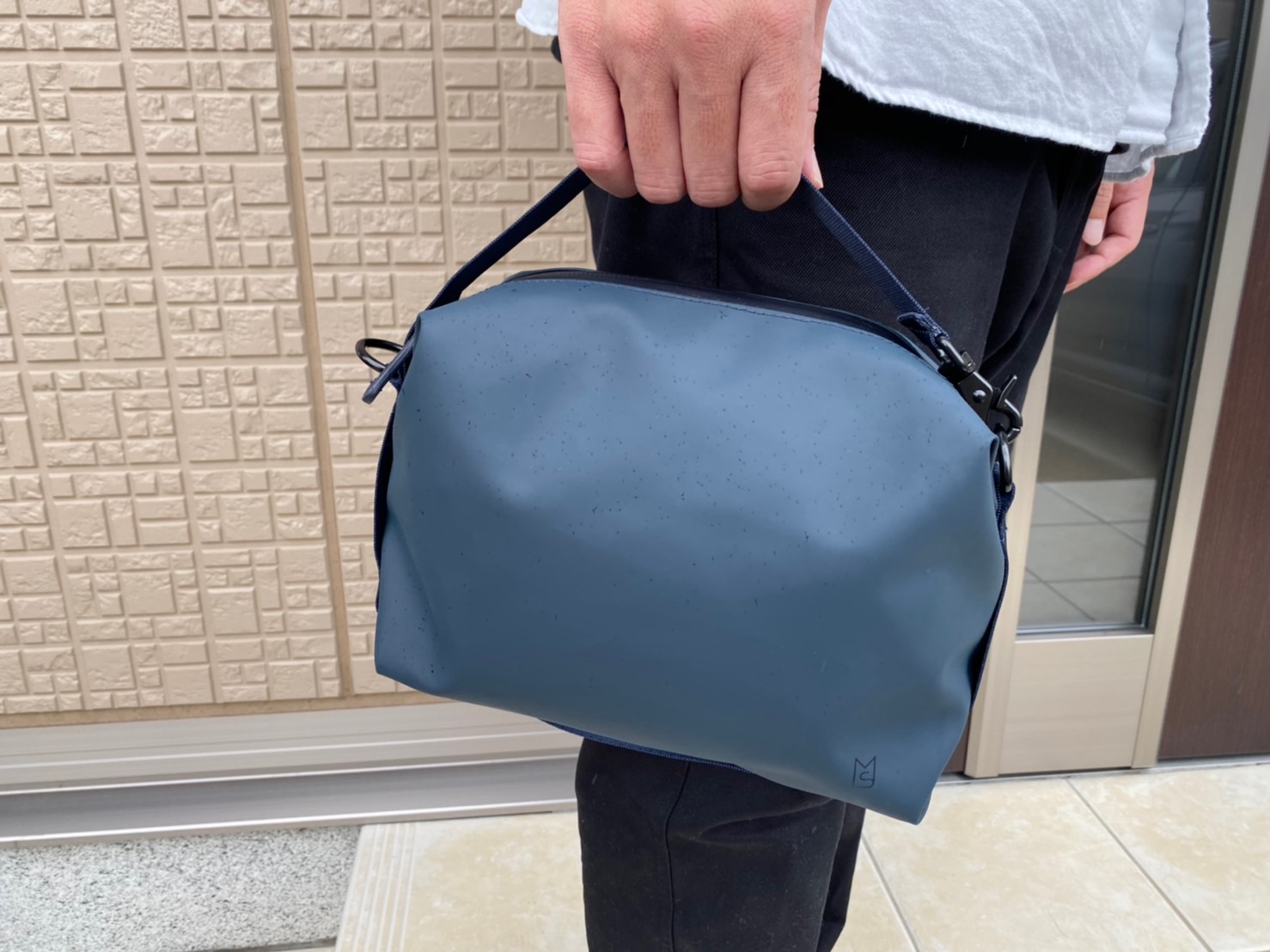 両サイドにDカンが付いているので、ハンドルが固定されている側のDカンに付けるとこんな感じに。手首にかけたりして、クラッチバッグ感覚で持ち運べるから、ポーチ単体でも使えます。ちなみに撮影時、ちょうど(笑)雨が降ってきました。