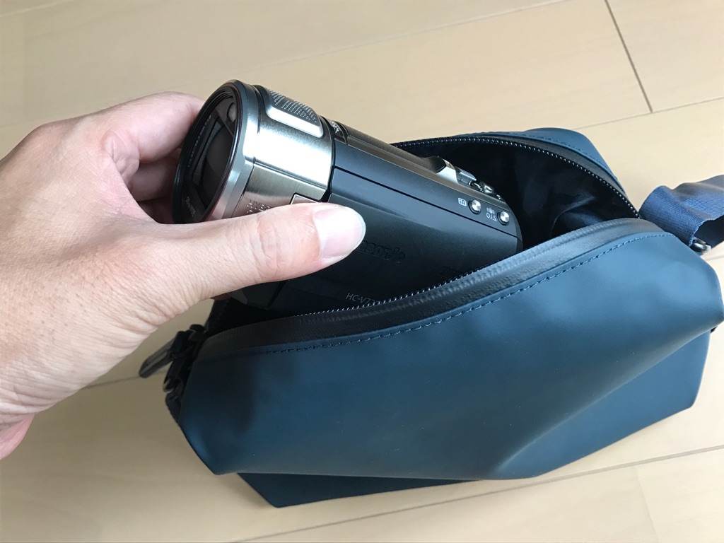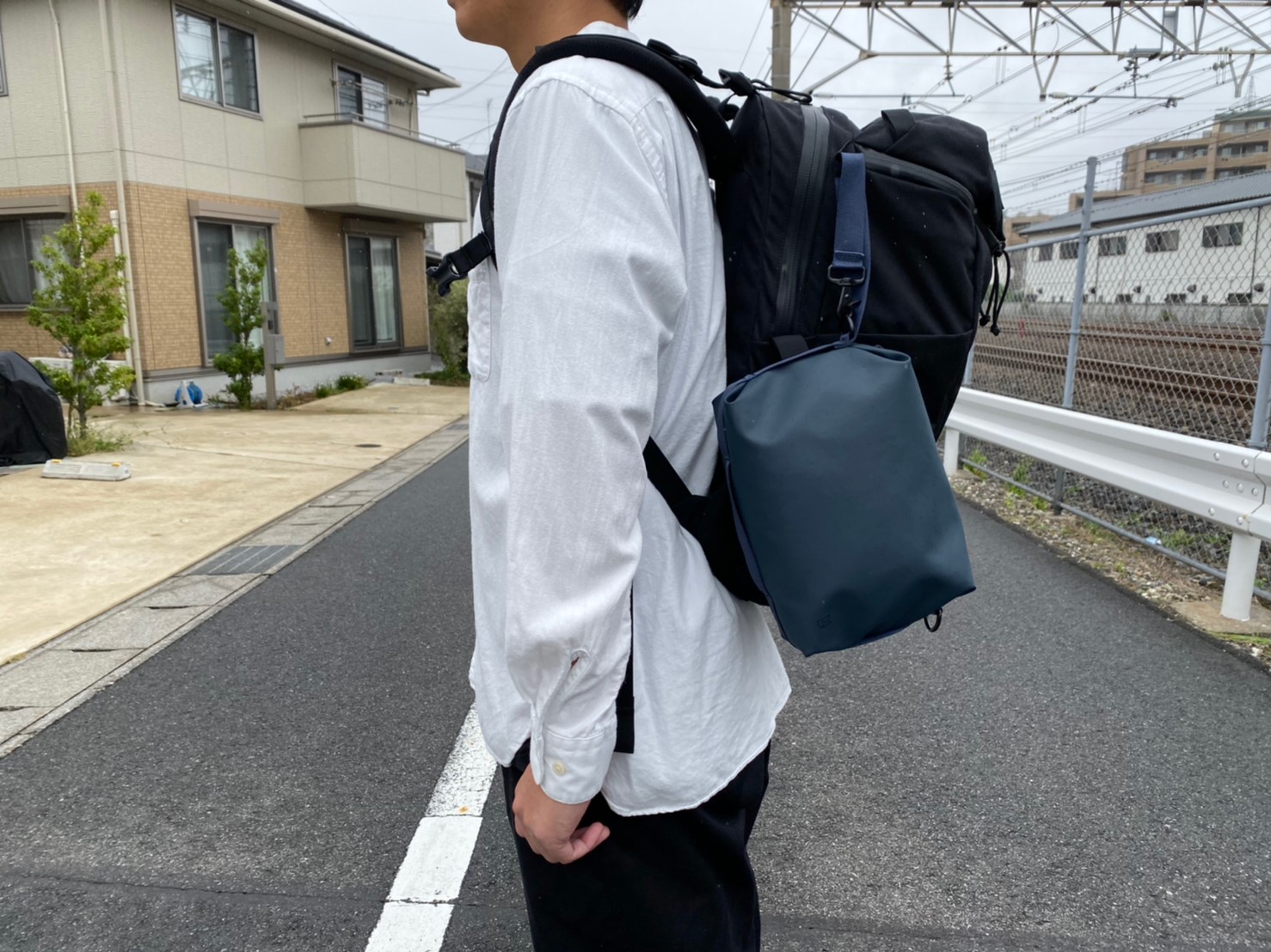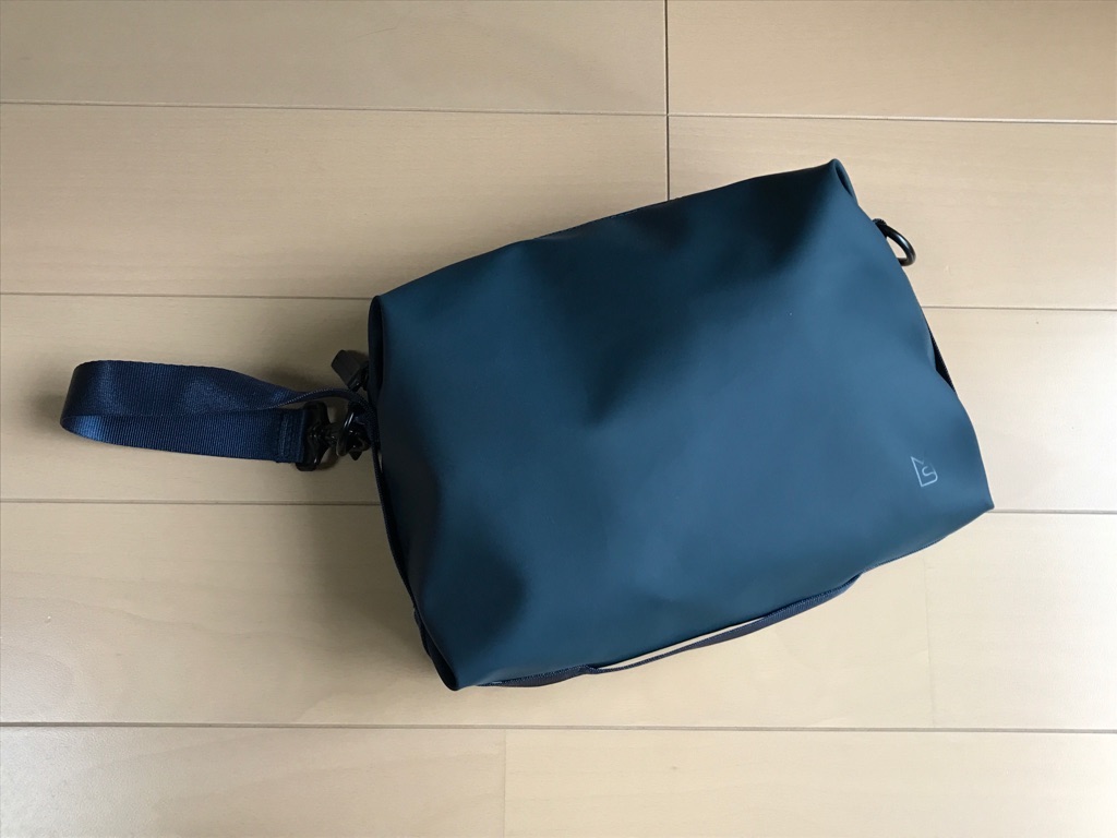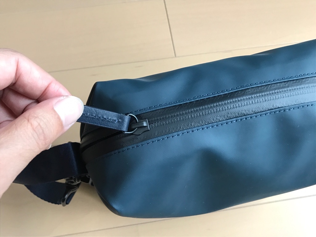 両サイドにDカンが付いているので、ハンドルが固定されている側のDカンに付けるとこんな感じに。手首にかけたりして、クラッチバッグ感覚で持ち運べるから、ポーチ単体でも使えます。ちなみに撮影時、ちょうど(笑)雨が降ってきました。