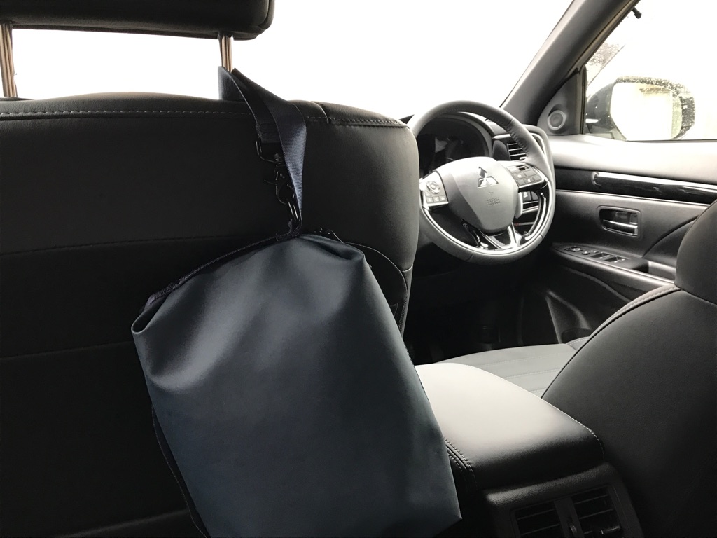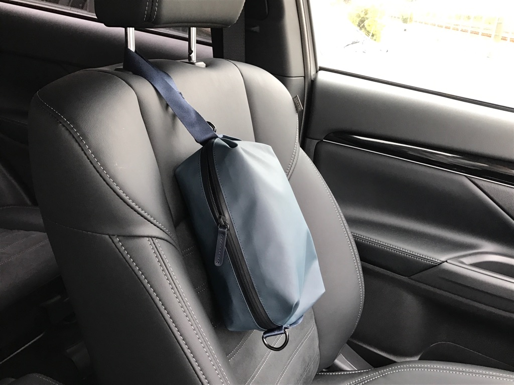 ふと思いついたのが、クルマでの使用。ヘッドレストのアームに引っ掛けておけば、サングラスや財布の置き場所として重宝します。そしてクルマから降りるときは、ポーチごと持ち出せばOK。必要な荷物はすべてポーチに入っているというワケ。これすごい便利!