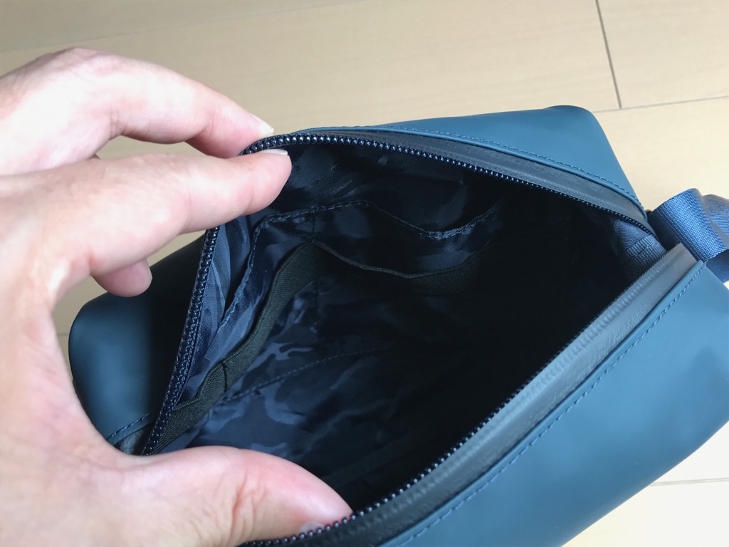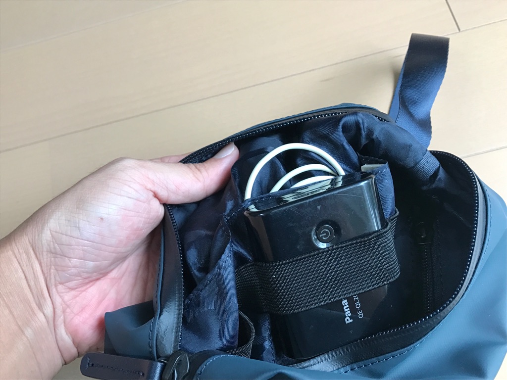 内装にはファスナーポケット、オープンポケット、ゴムベルトを搭載しています。モバイルバッテリーなどはベルトで固定、ケーブル類はオープンポケットに。USBメモリなどの小さな物はファスナーポケットに入れておくといいですね。