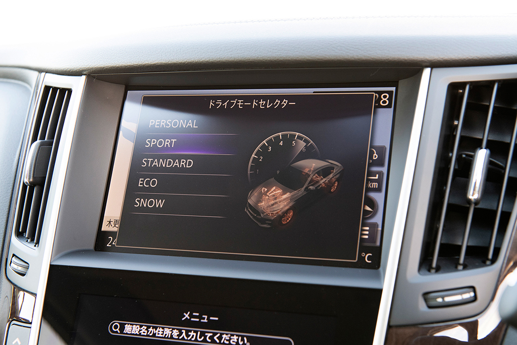 話題のプロパイロット2.0は、ハイブリッド仕様のみに装備であり、V6ターボモデルでは選ぶことができません。しかし、前方車両との車間距離を保って走行する“インテリジェントクルーズコントロール”、危険を検知すると衝突回避を支援する“インテリジェントエマージェンシーブレーキ”といった先進運転支援システムが備わります。