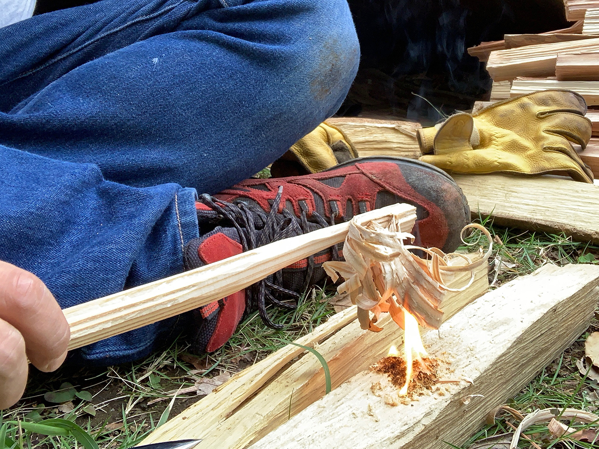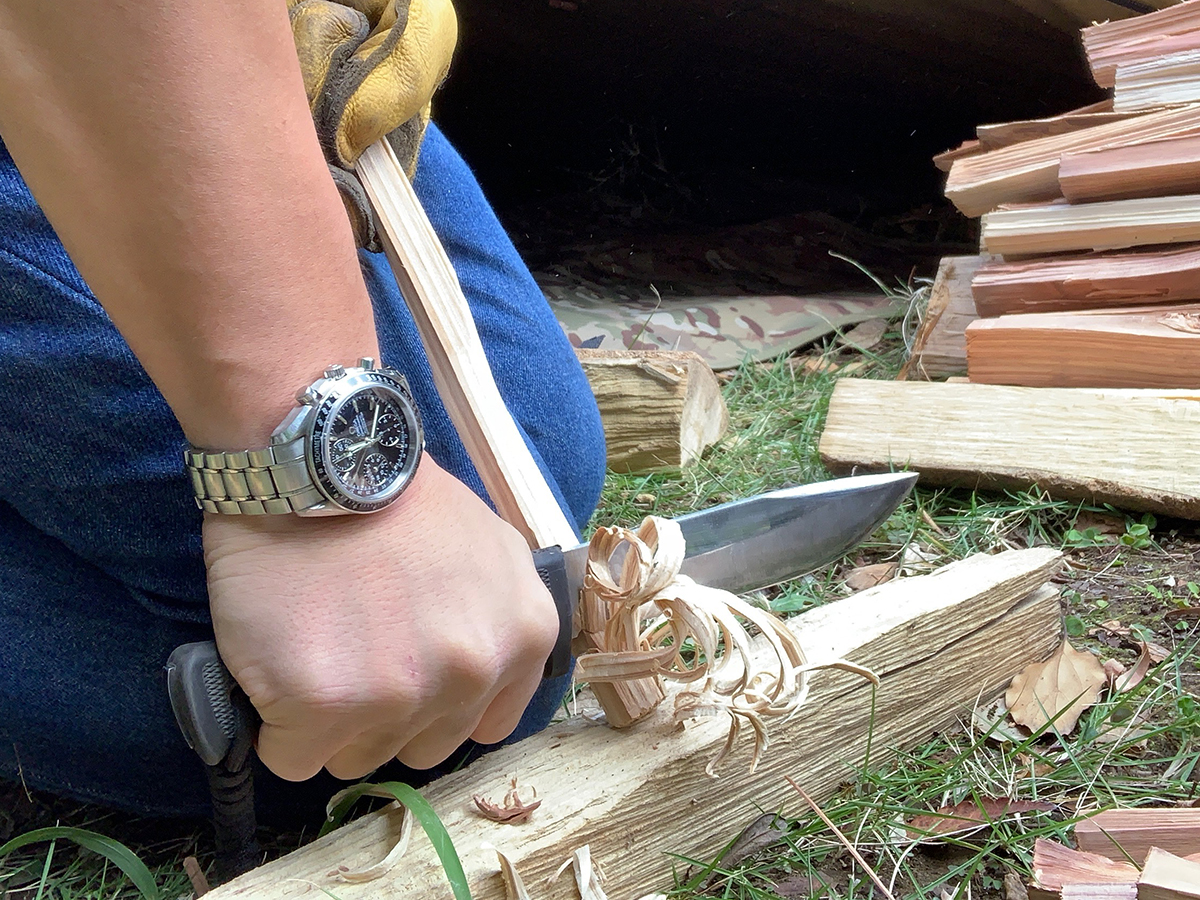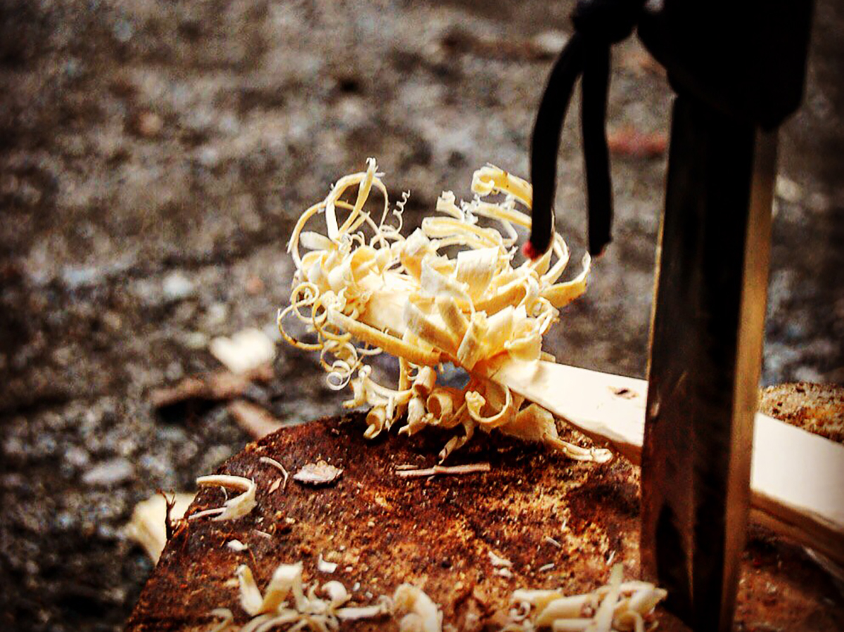 つまり、フェザースティックを作れれば、着火剤を使用することなく、購入した薪だけで着火ができてしまうわけです。ただし、火口として使用するには薪がちゃんと乾燥していること、そして、かなり薄くフェザー(羽根)のように削る技術が必要です。