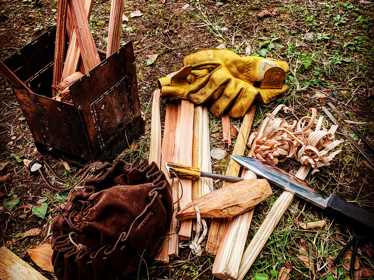 フェザースティック作りに必要なのは、刃渡り8〜15cmで刃厚4〜6mm程度のナイフと革製のグローブ(なければ軍手でもOK)です。着火にはファイヤースチール、火口にはファッドウッドや麻紐などかがあるといいでしょう。