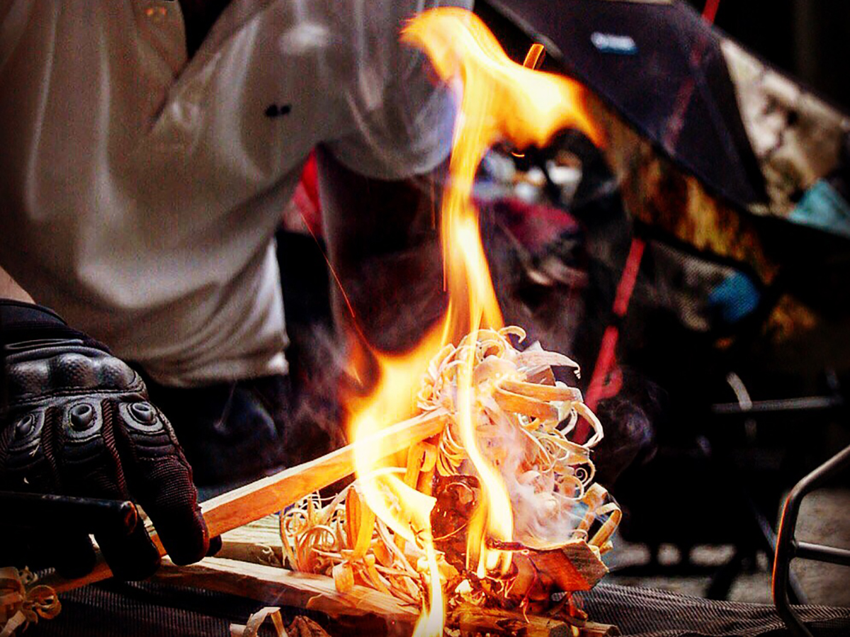 一番うまくできたと思うフェザーに直接着火(マッチやライターでも、可能であればファイヤースチールで)する方法でも良いですし、ファットウッドや、麻紐などの火口に火を付けてから、フェザースティックに火を付けても良いです。