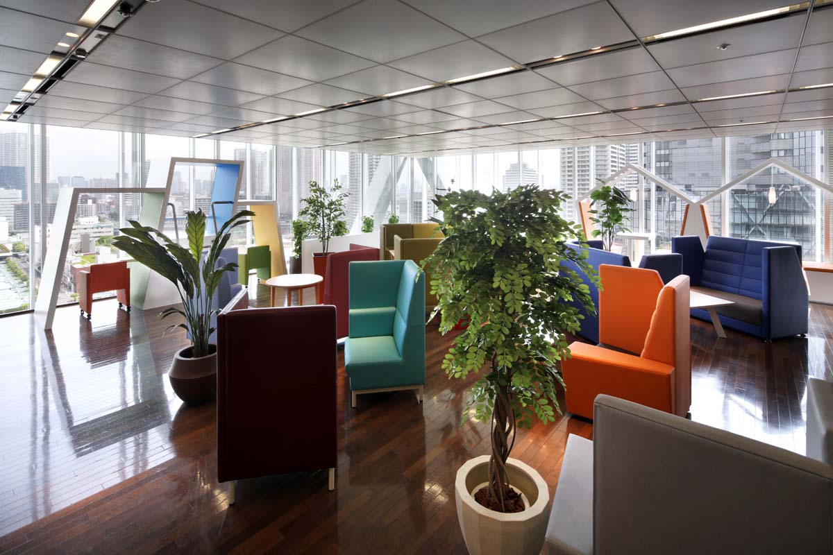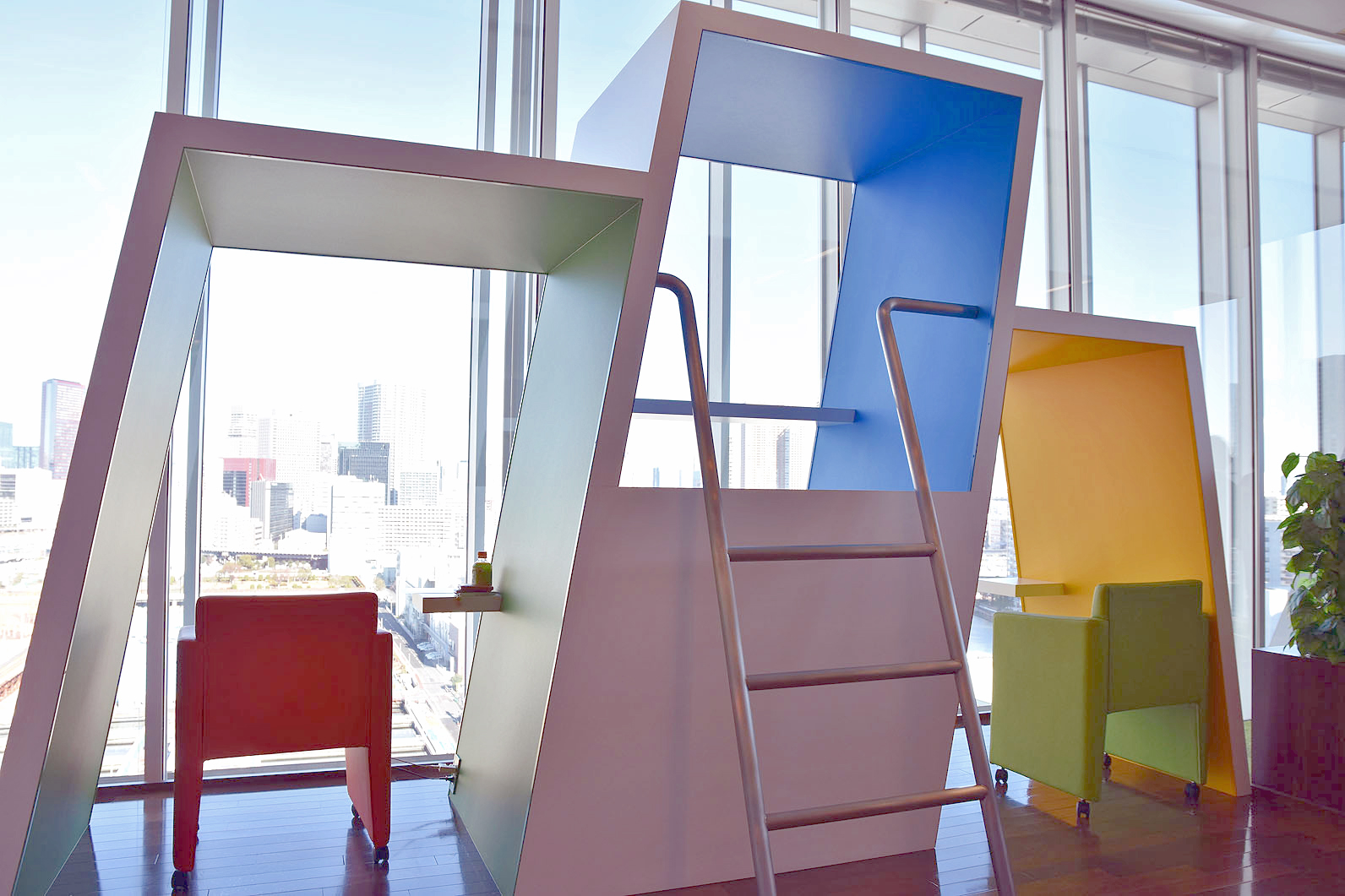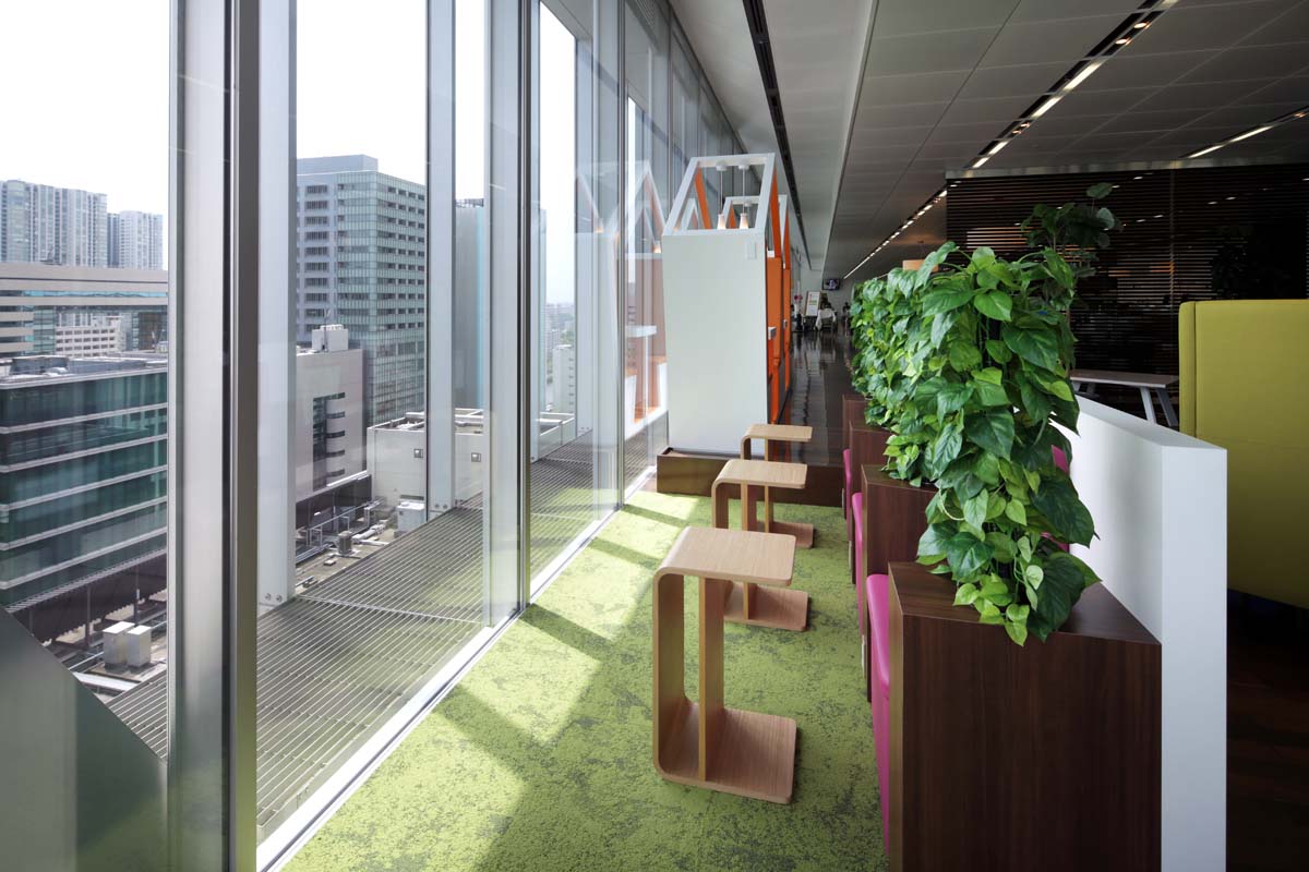ソニー本社内にある、社員食堂フロア。その奥にぐぐっと進み、ビュッフェコーナーの奥にあるのが、窓ガラスに囲まれた「リラックスゾーン」。