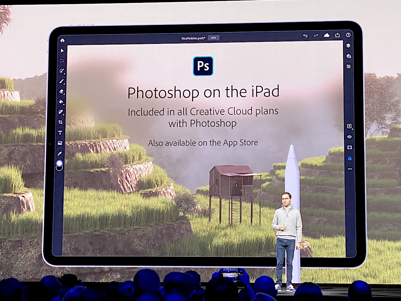 一番のトピックはやはり、「Adobe Photoshop iPad版」の提供が開始されたことです。機能は「画像合成」「レタッチ機能」「画像のマスク」という3種類のタスクにフォーカスした内容に。なお、現時点では基礎を優先したミニマムな構成ではありますが、今後のアップデートで順次機能が足されていくとのこと。