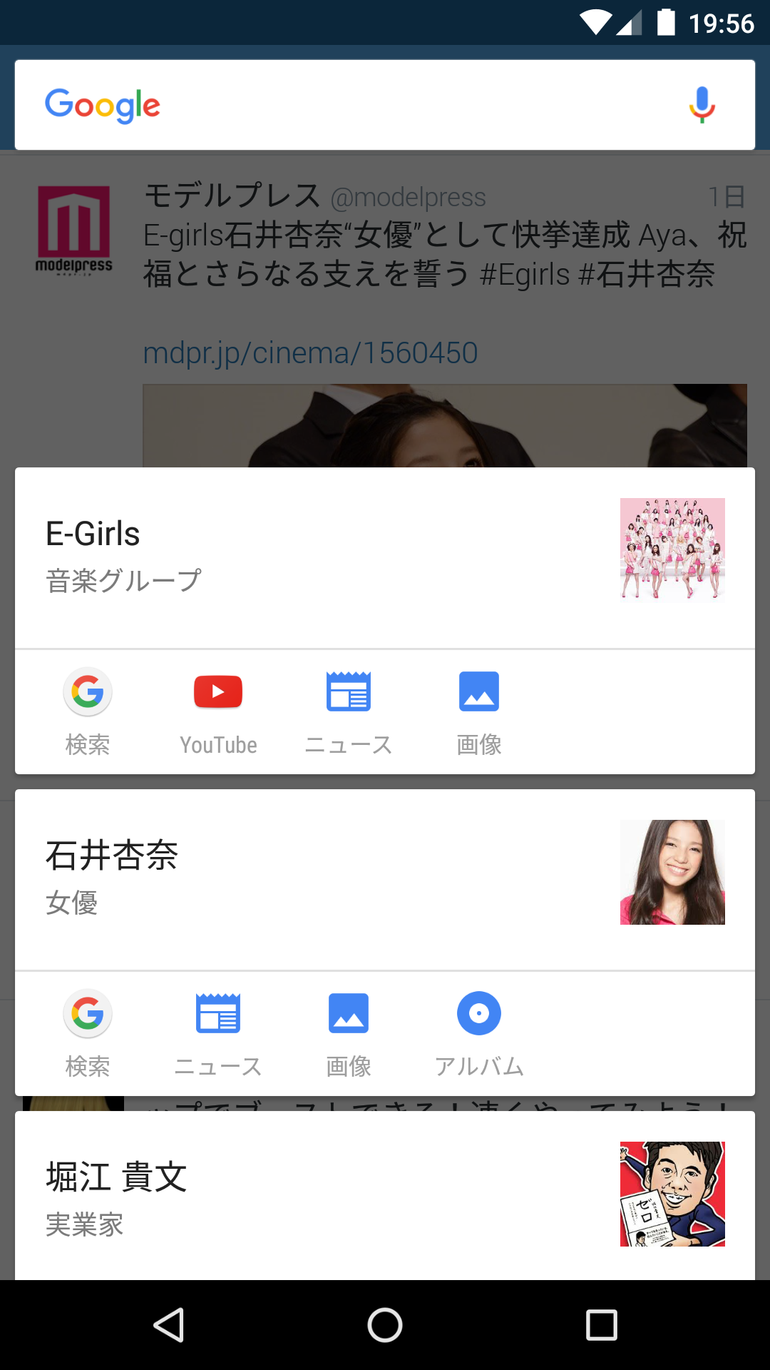 これまでは、その人名をコピーして、ブラウザを起動して、その人名を検索するという一連の操作が必要でした。それが、Now on Tapを使うと、表示されるカードからワンタップでGoogle検索に進んだり、その人の画像やニュースをチェックしたりできるんです。