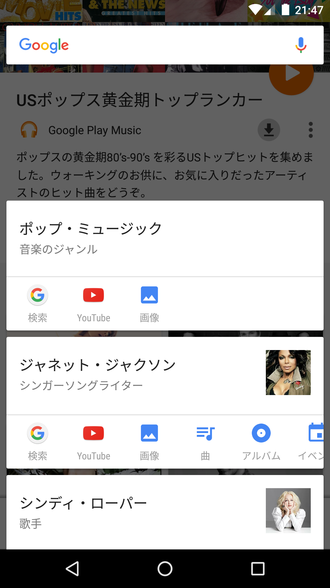 「Google Play Music」などで音楽を聴いていて、「このアーティスト、いいなぁ、気になるなぁ」と思ったときにも役立ちます。