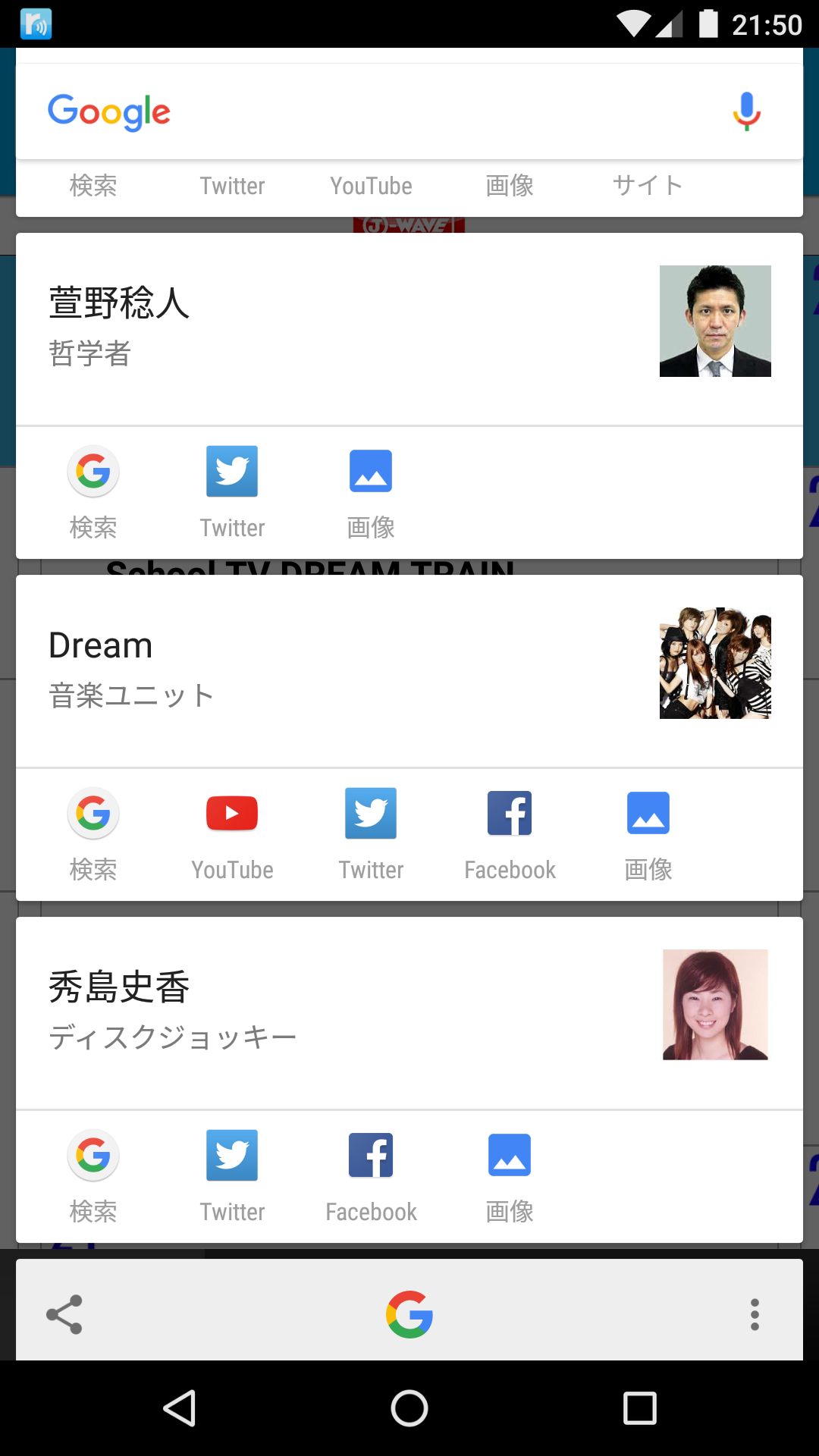 Now on Tapは、画面に表示される固有名詞がすべて検索対象になるわけではありません。かといって、知りたいと思っていることがカードに現れないことは稀。ちょうどいい感じで、気になっているキーワードがピックアップされる印象です。