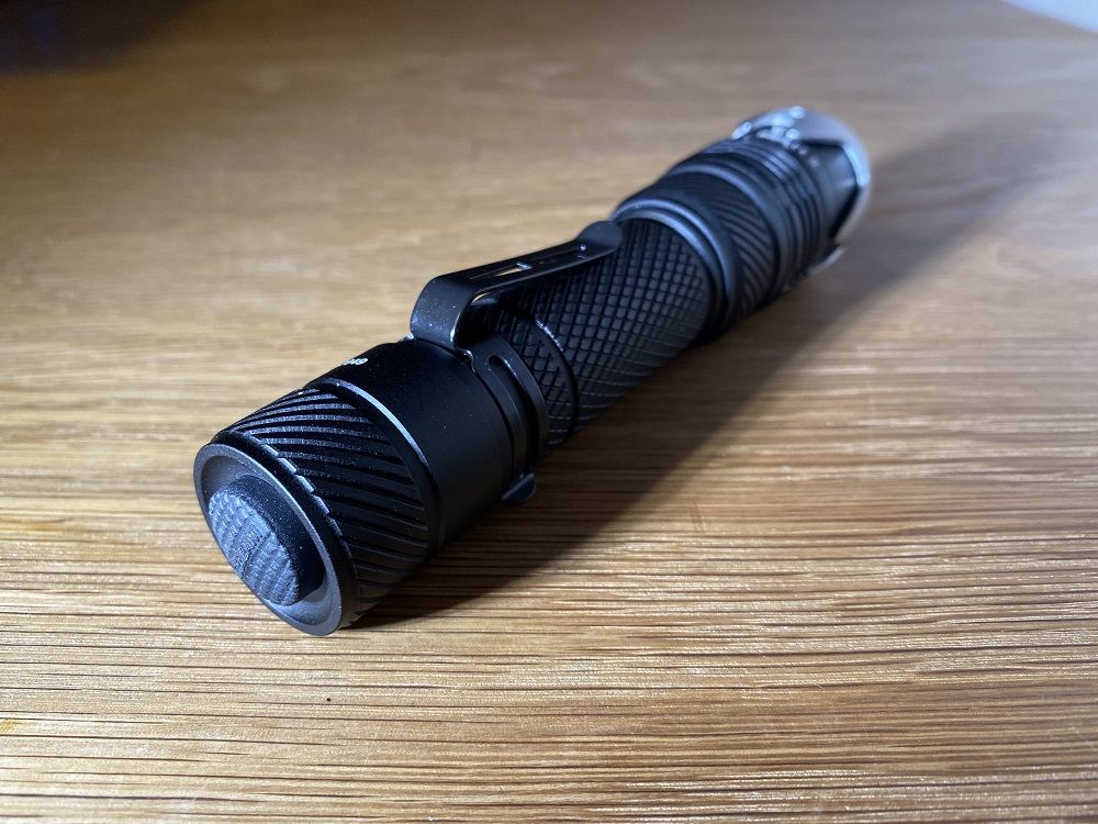 ビーム照射角3.1度という鋭い照射を可能にする要因の1つがこちらのレンズ。凸形のレンズを保護する目的でステンレス製のベゼルリングが付いています。リングは着脱可能。装着の向きを反対側にすればストライクベゼルにようになりますが、携帯するのであればこのまま使うのがいいかと思います。これでも十分に落下時の衝撃を緩和してくれると思います。