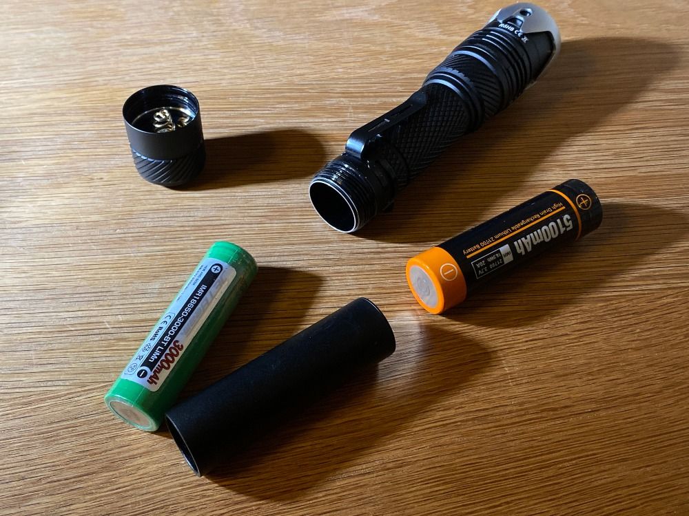 付属充電池はIMR21700形。18650形充電池よりもひと回り長く、太い充電池です。放電能力は20Aと非常に高く、安定した初期照度の維持に貢献します。付属品として18650形充電池およびCR123乾電池2本が装填可能なアダプターがあります。乾電池使用時はランタイムが短くなります。18650を使用する場合は、付属充電池同様にIMR(リチウムマンガン)を使ってください。