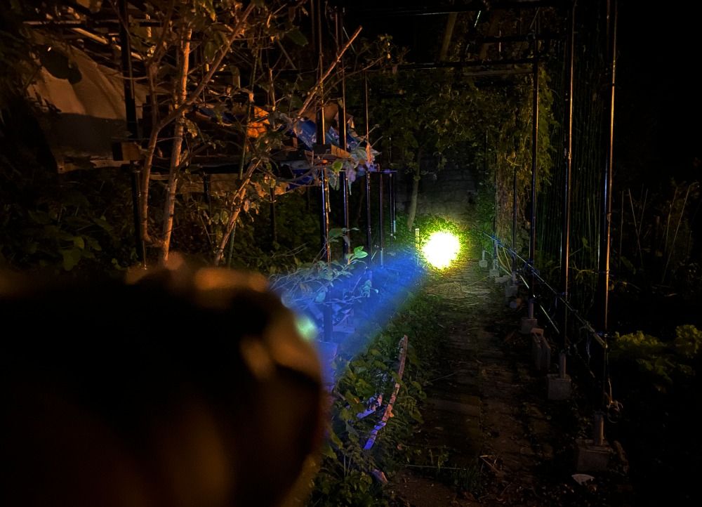 メーカー公称のビームディスタンス1kmが確認できるかというと難しいですが、夜空に向かって照らしたくなるライトであることは間違いありません。星空の観測にレーザーの代わりにも十分使えることでしょう。広く照らすことはできませんが、ポインターとして1点を強く照らすような使い方には適しています。ただ、あまり近いと反射光がまぶしくて仕方ありません。数十メートル離れた場所を「ここだよ」と照らし指示するようなライトです。使う用途は限定的でありますが、それをこのサイズで実現したモデルは他にありません。