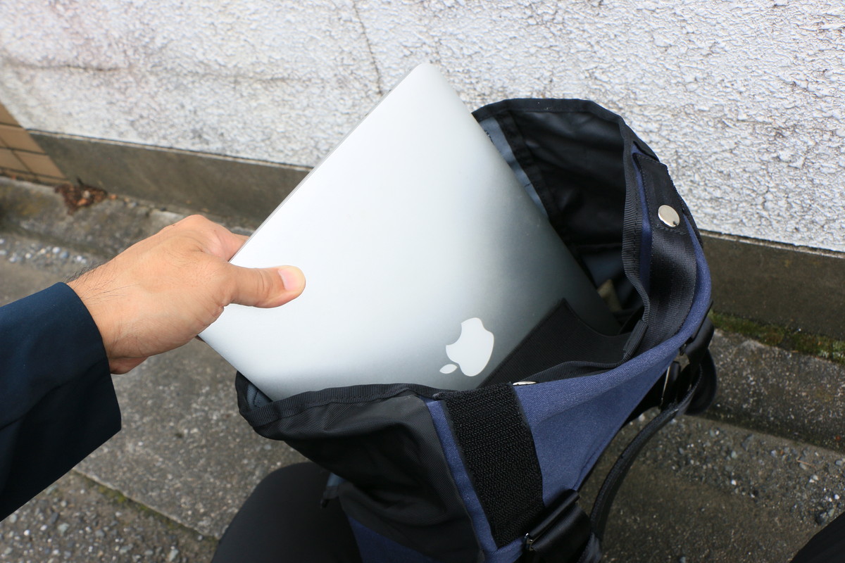 メイン開口部はロールトップ式なのですが、サイドにも開口部の大きいファスナーが装備されているので、トートバッグとして肩に掛けたまま、中身を取り出せるのもうれしいところ。PCスリーブも横に開閉できるので、ノートPCも素早く取り出せます。