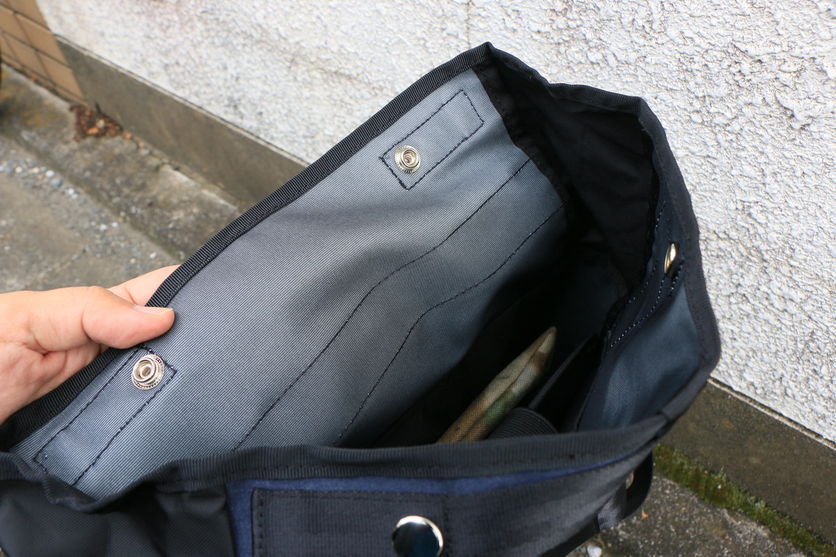 メイン素材は3レイヤーのCORDURA NC Fabric。防水性もあるので、ちょっとした雨でもそのまま自転車に乗れます。しかも、この素材が地下足袋用の染料で染められているんです。CORDURAなのにカラーリングされているという独特の質感。世界でもこの素材を使っているのはberuf baggageだけらしいのですが、見た目の質感と防水性・耐久性を両立しているこの素材感はかなり気に入っています。