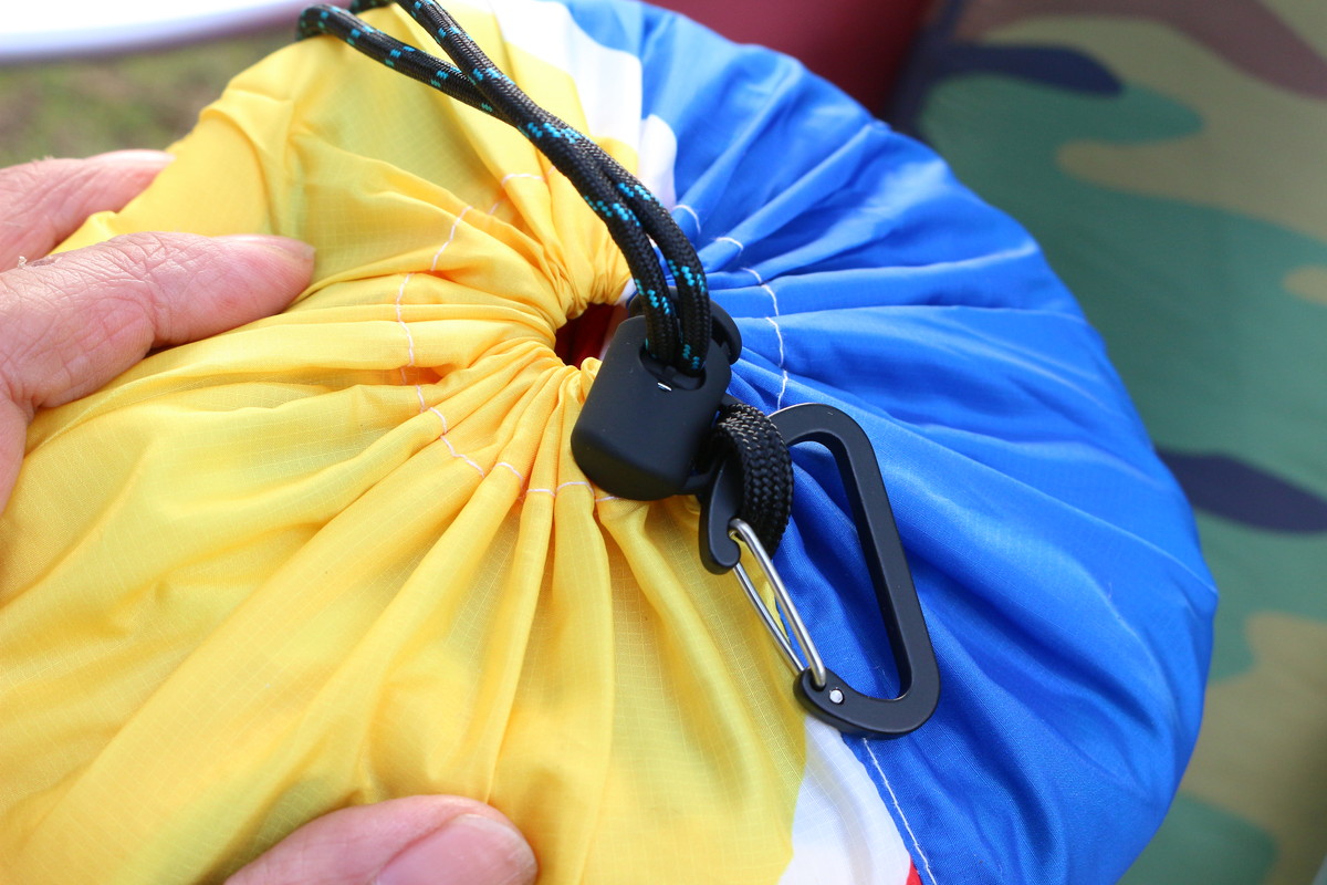 収納袋には、カラビナが付いています。このカラビナを使ってブランケットを吊るすにしても、収納袋をなくさないようどこかに引っかけておくのにも都合良し。