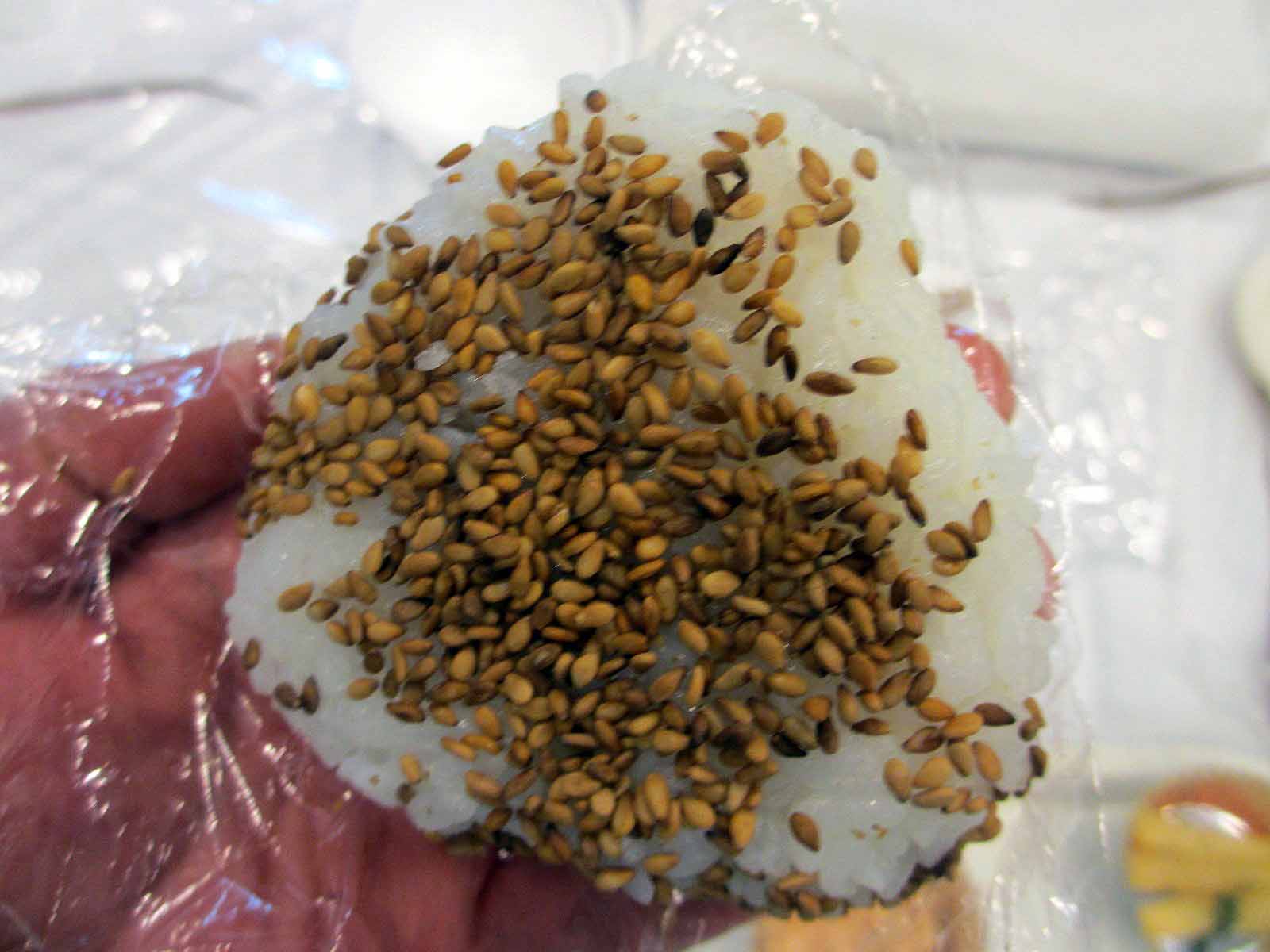 ⑤三角に形を作りながら握り、仕上げに塩とゴマをまぶします。