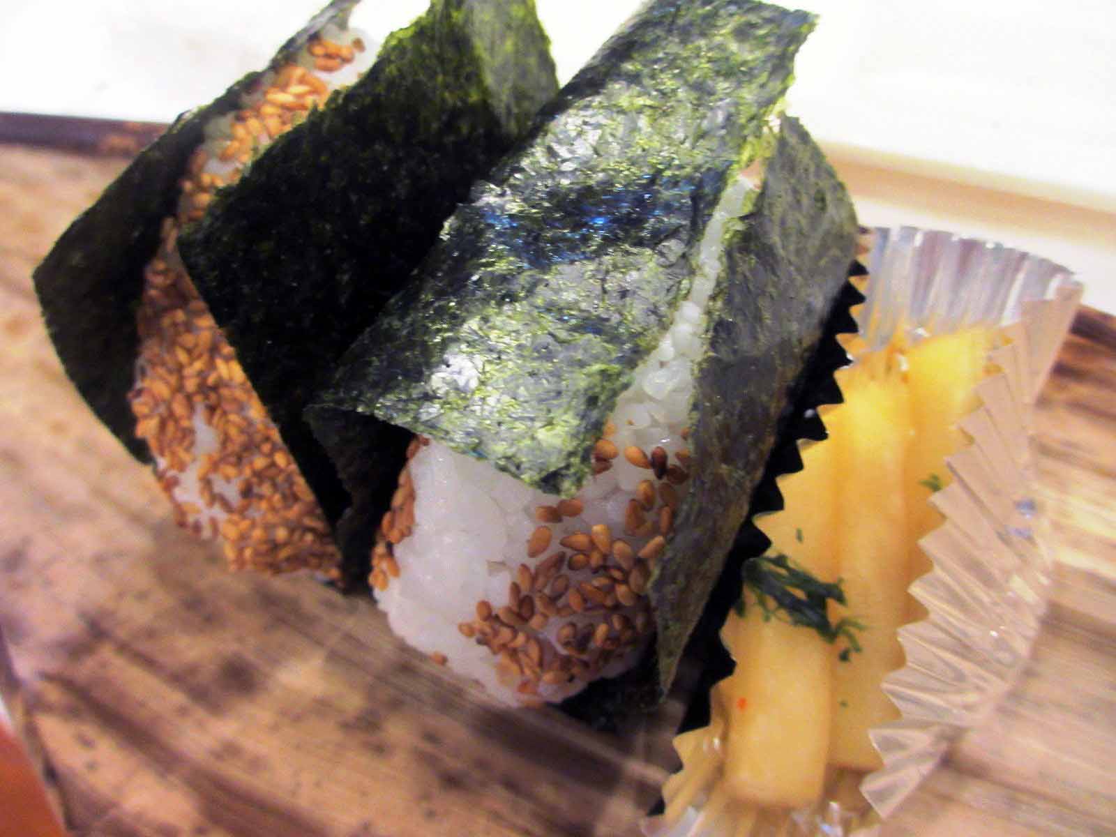 日本初の駅弁「おにぎり弁当」にならい、黒ゴマをつけた塩むすび2個。