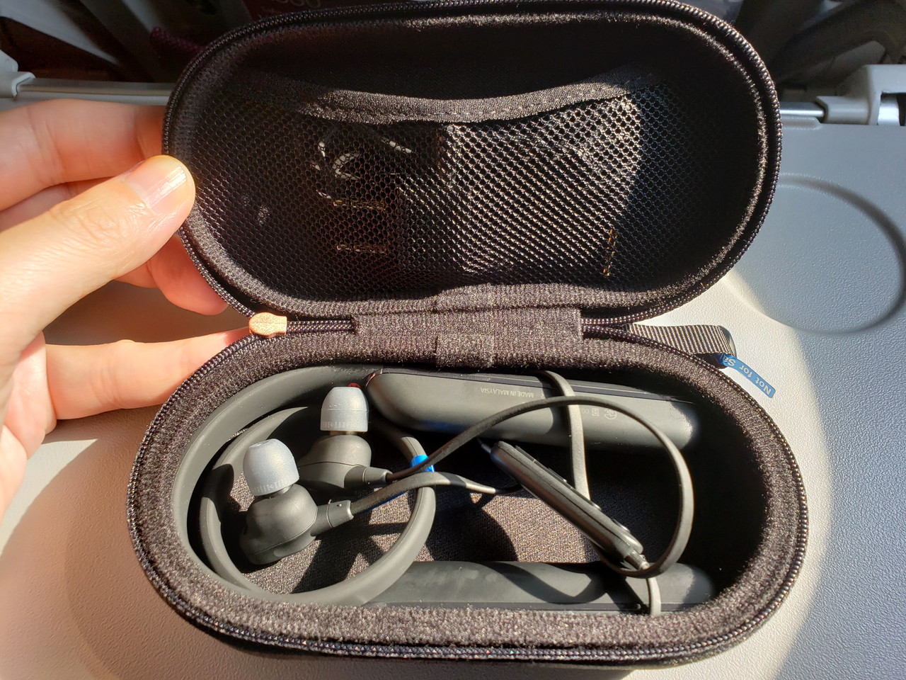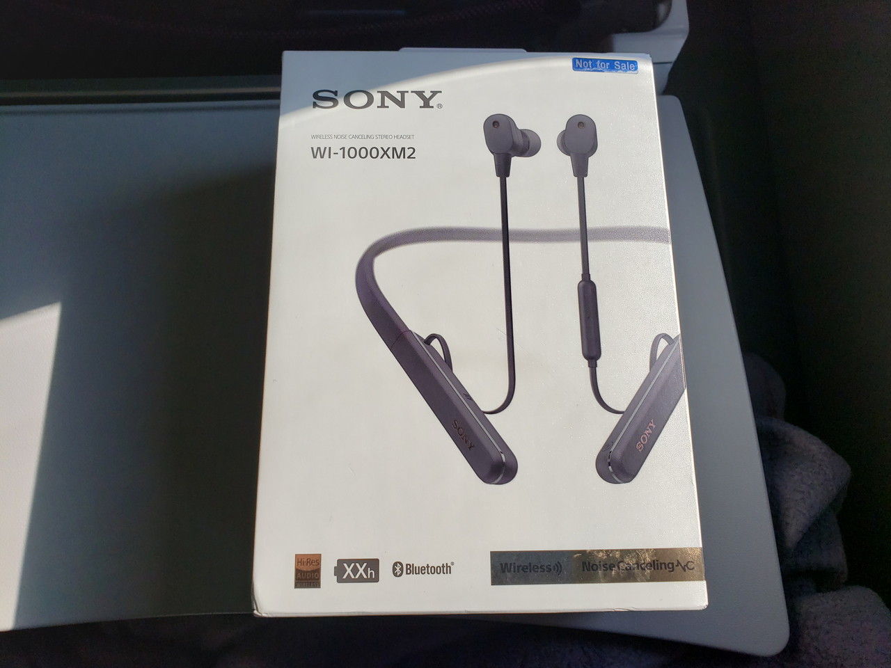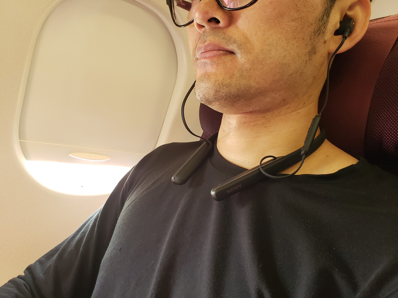 飛行機の中では気にところというと、やはりノイズキャンセル。「WI-1000XM2」は最上位モデルだけあり、相当に効果があります。騒音としては最も条件の厳しい飛行機内でもゴーという耳障りな騒音を感覚的には1/5くらいまで下げてくれて、気にならないレベルに。