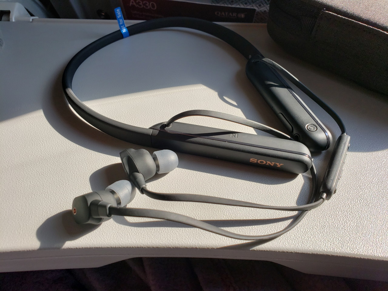 フライト用と考えた場合、ヘッドホンだと寝るときに邪魔になるし、完全ワイヤレスだと長時間フライトではバッテリーが持たない。そうなると、いわゆるワイヤレスイヤホンタイプの「WI-1000XM2」が一番ストレスがないんですよね。