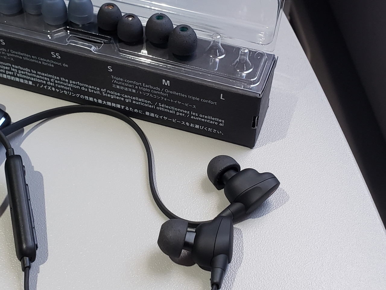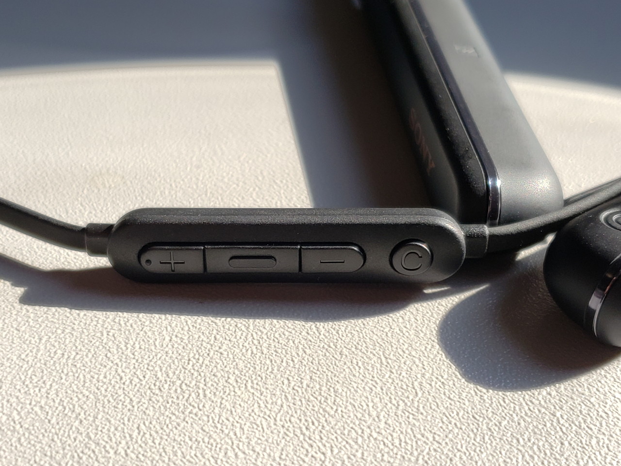 リモコンはネックバンドからイヤーピースへの途中に付くタイプ。音量+/-はダイレクトに操作できるし、中央のボタンでは再生/停止、曲送り/戻しも操作可能。でもリモコンが首の横にぶら下がる形は、個人的には邪魔で操作しにくいかなと。旧モデルはネックバンド部に一体化していたんですけどね。