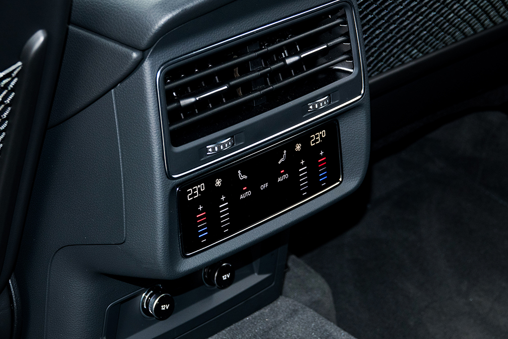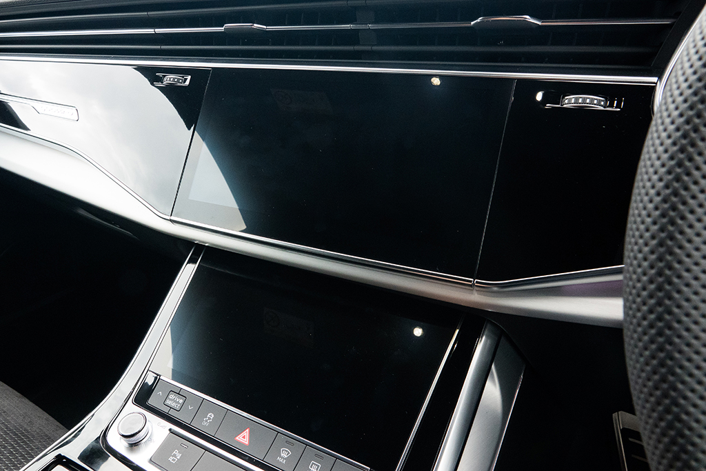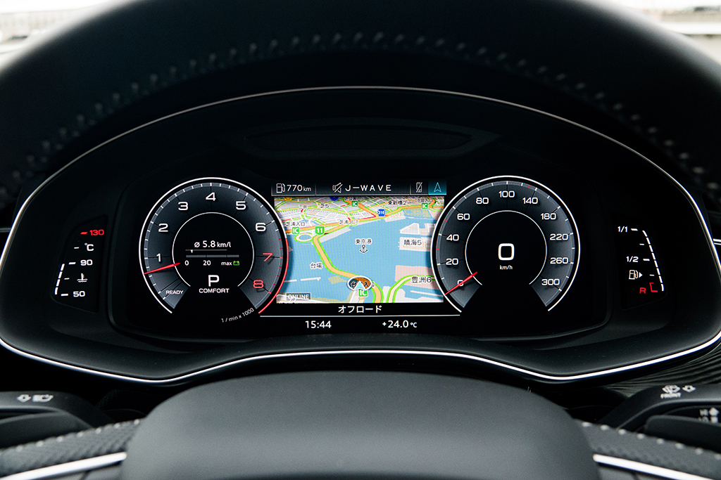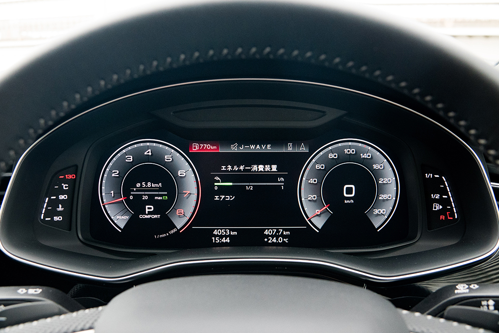 コックピットの雰囲気は、最新フェーズのアウディ車そのもの。ほぼ全面に地図を表示できる12.3インチのフル液晶メーターパネルに加え、インパネのセンター部分に10.1インチと8.6インチというふたつのタッチパネルディスプレイを上下に並べた、特徴的なインターフェースがドライバーを迎えてくれる。